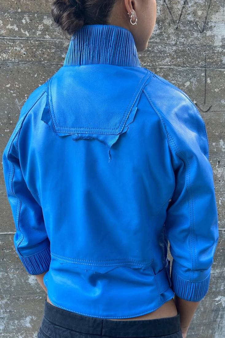 Women’s genuine blue leather jacket motorcycle jacket zip front slim fit