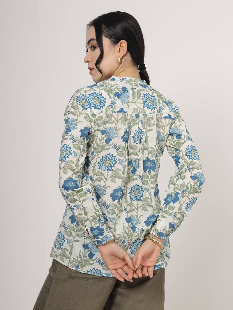 Blue floral cotton top with mandarin collar