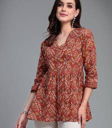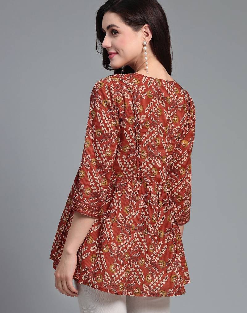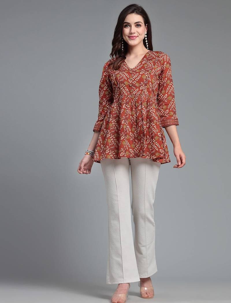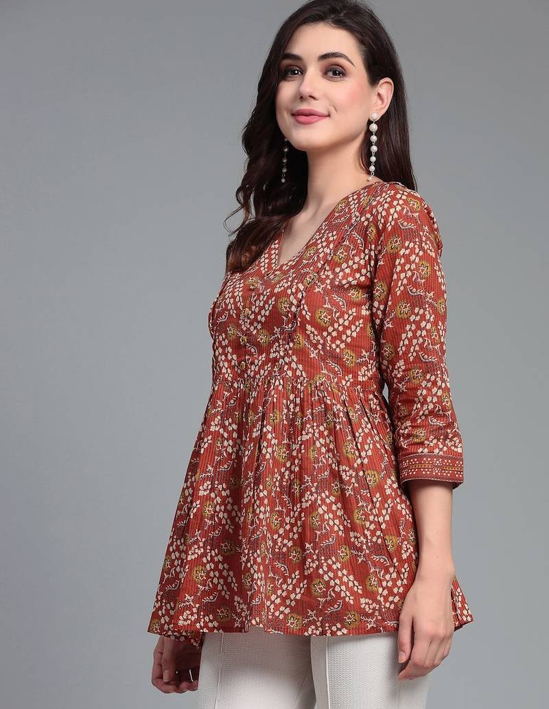 | Product Name | Burnt Orange Floral Printed V Neck Cotton Top | |
