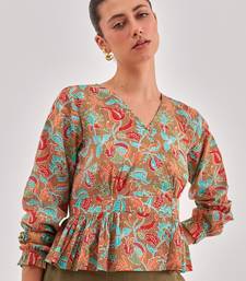 | Product Name | Khaki Floral Printed Cinched Waist Top With V Neck, Long Sleeves With Ruffles | |