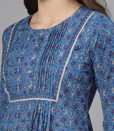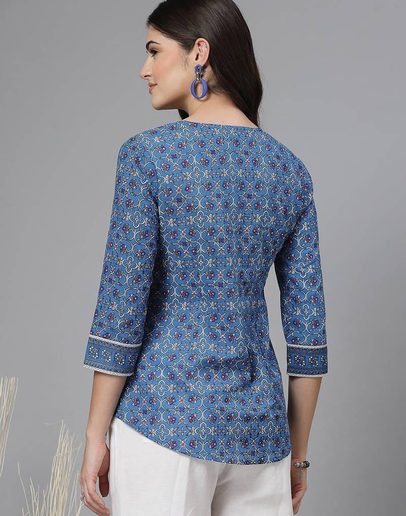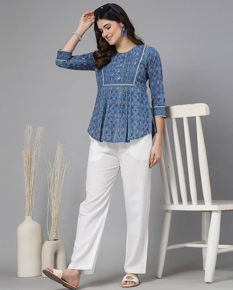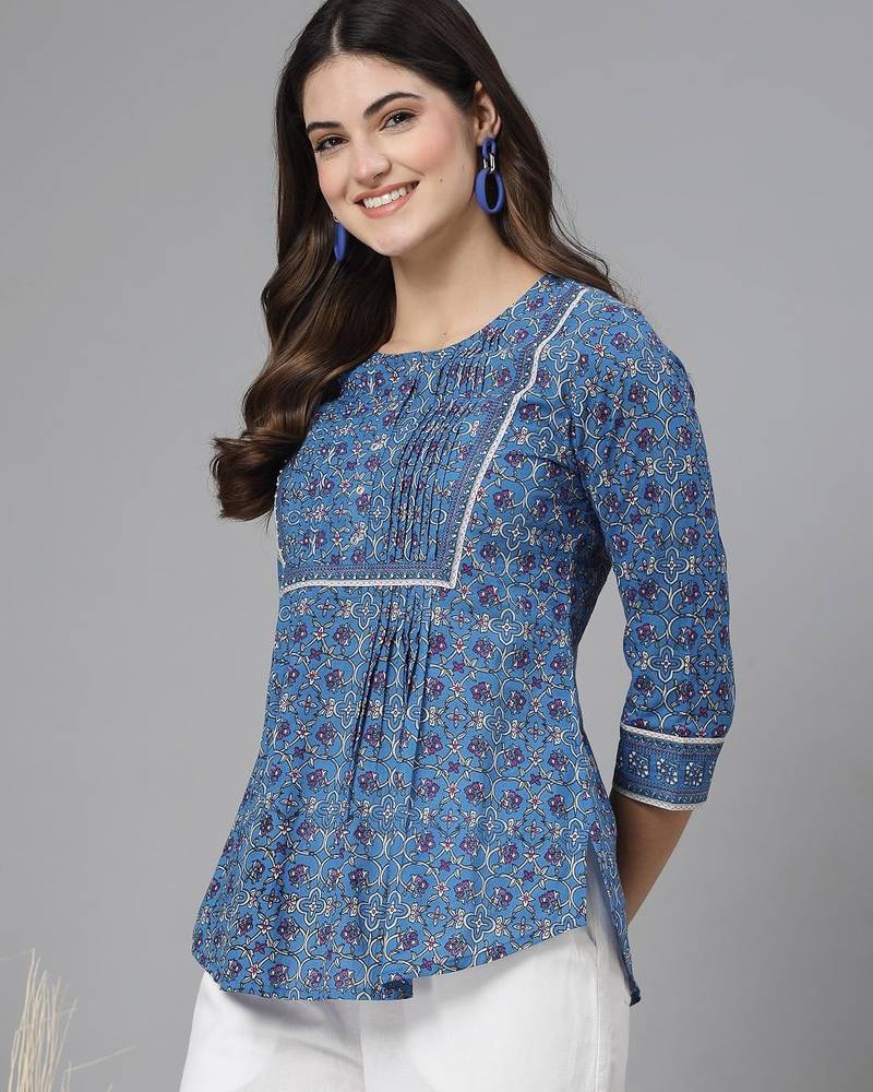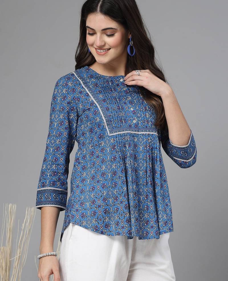 | Product Name | Royal Blue Floral Print Pintucks Top With Round Neck And Button Closure | |