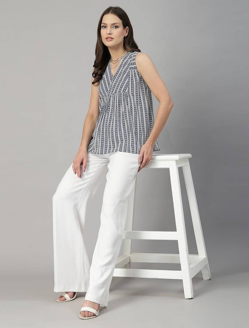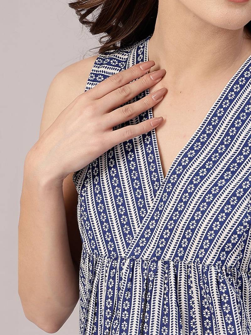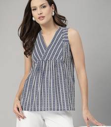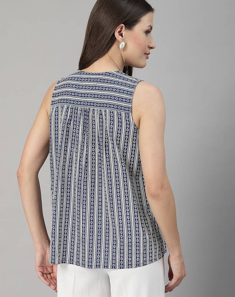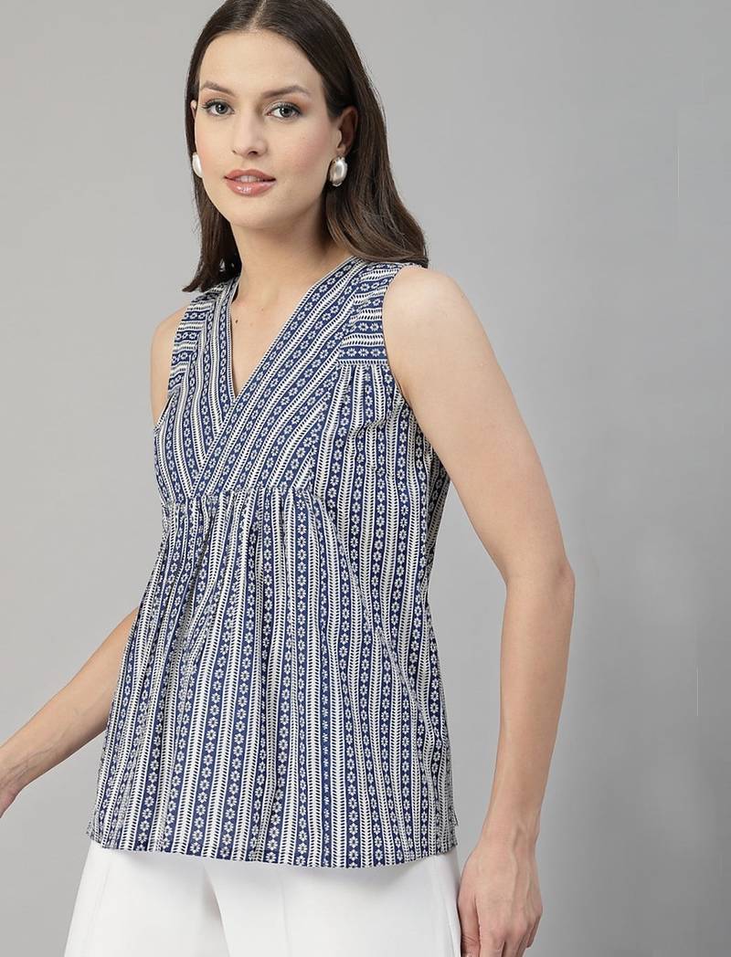 | Product Description | A Sleeveless Prussian Blue Striped Cotton Top With V Neck |