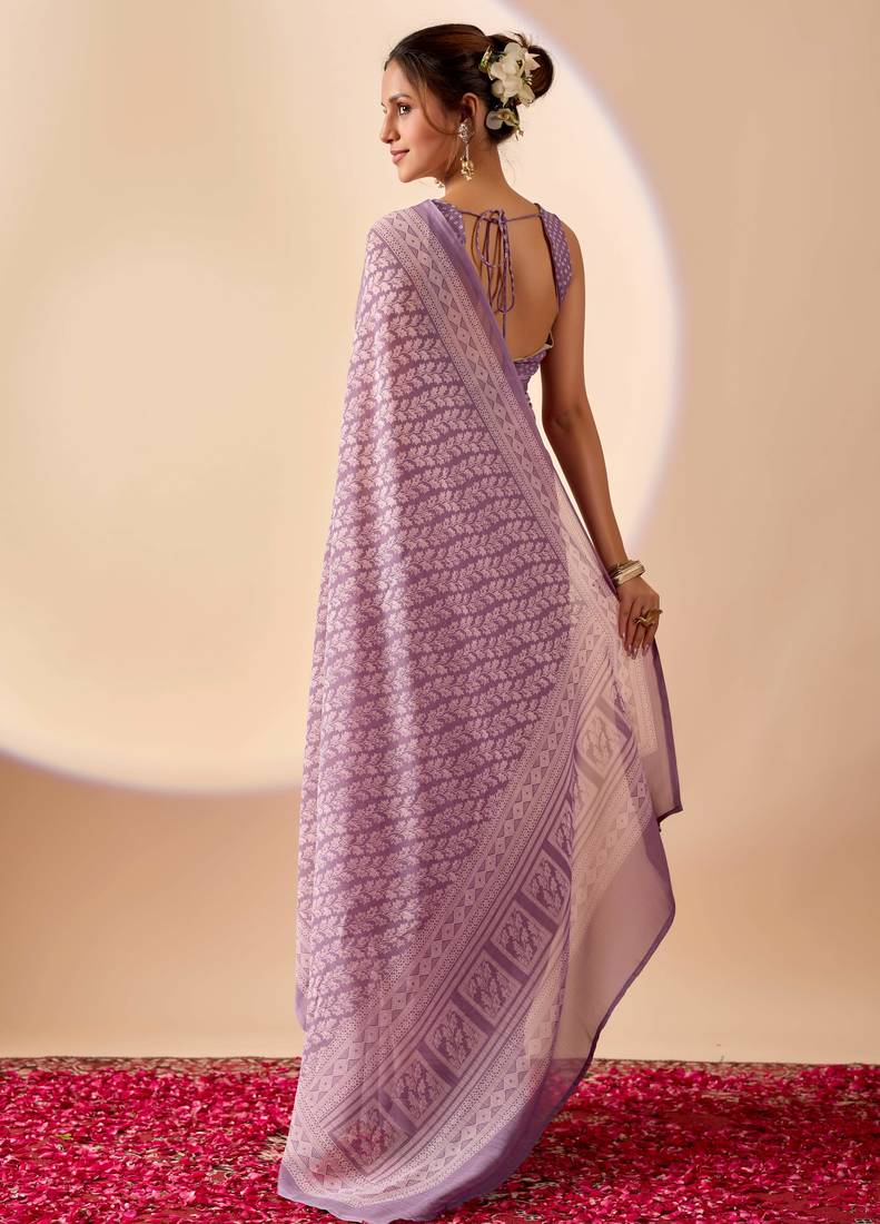 Lavendar digital floral print chiffon festive ethnic saree with blouse