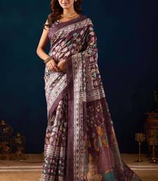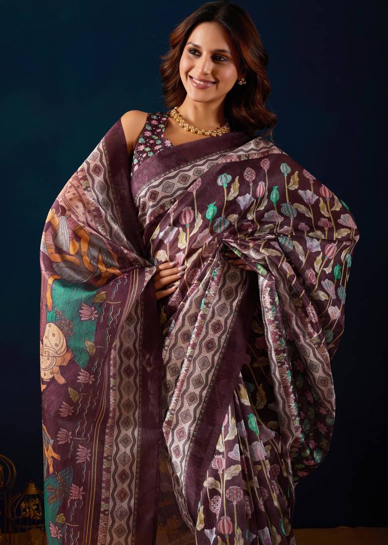 Wine kalamkari tussar blend festive wear ethnic saree with blouse