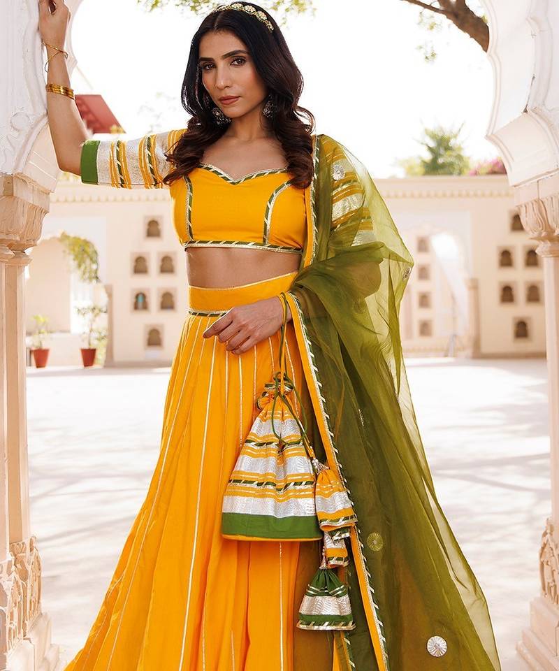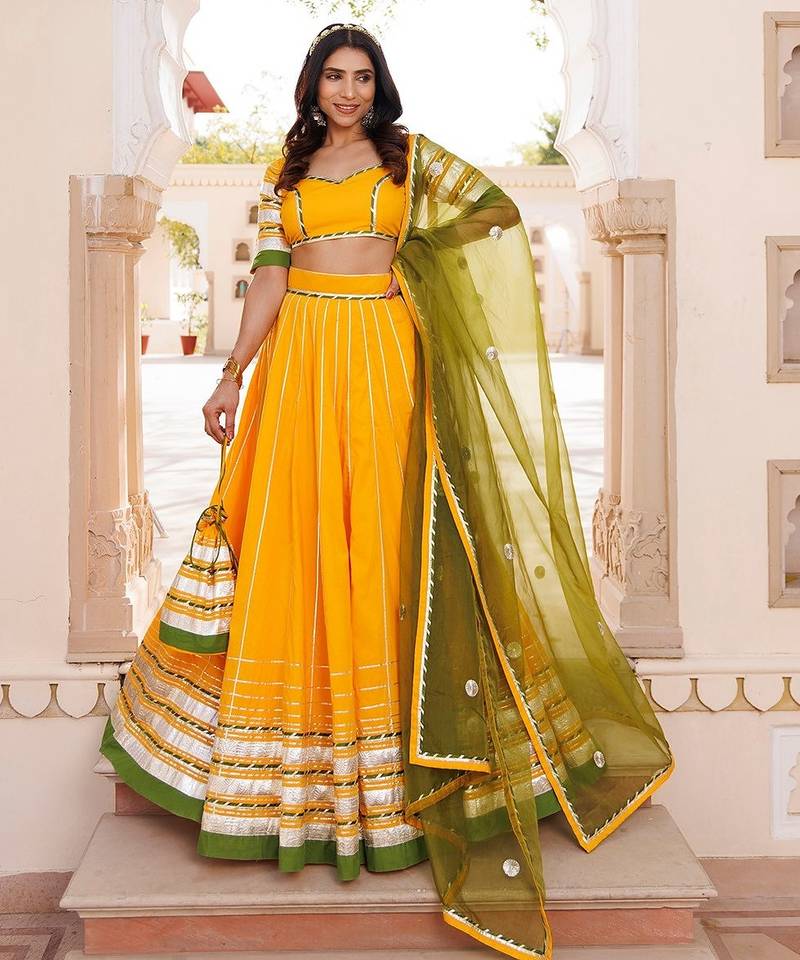 | Product Description | Discover Our Exquisite Yellow And Green Lehenga Choli Set Crafted From Premium Cotton Fabric, Complemented By An Organza Dupatta. Adorned With Intricate Gota Work Embellishments, Its Sweetheart Neckline And Half Sleeves Exude Elegance. This Solid Colored Ensemble Promises A Vibrant And Sophisticated Appearance, Ideal For Festive Celebrations And Special Occasions. Elevate Your Style With This Stunning Attire, Blending Traditional Charm With Contemporary Finesse. Experience The Epitome Of Grace And Luxury With Our Exclusive Collection. Shop Now For The Perfect Ensemble That Captivates Hearts And Leaves A Lasting Impression. |