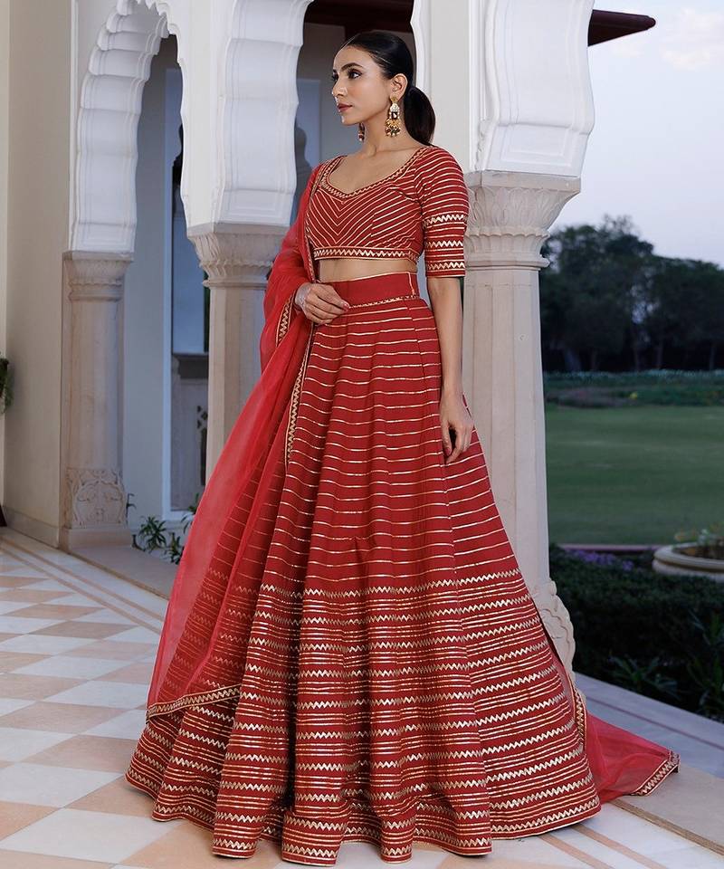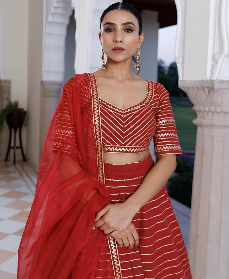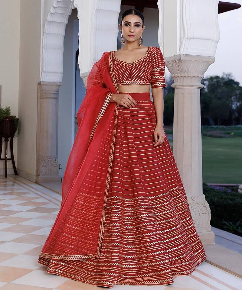 | Product Description | Discover The Epitome Of Elegance With Our Exquisite Red Cotton Lehenga And Choli Set, Complemented By An Organza Dupatta. Adorned With Intricate Gota Work Embellishments, The Choli Boasts A Charming Sweetheart Neckline And Half Sleeves. Perfect For Festive Celebrations, Parties, And Weddings, This Designer Ensemble Exudes Timeless Sophistication And Flair. Elevate Your Style Quotient With This Stunning Creation, Meticulously Crafted To Capture Attention And Leave A Lasting Impression. Experience The Allure Of Traditional Craftsmanship Fused With Contemporary Design In Every Stitch Of This Captivating Lehenga Set. Shop Now And Indulge In The Allure Of Luxury Fashion. |