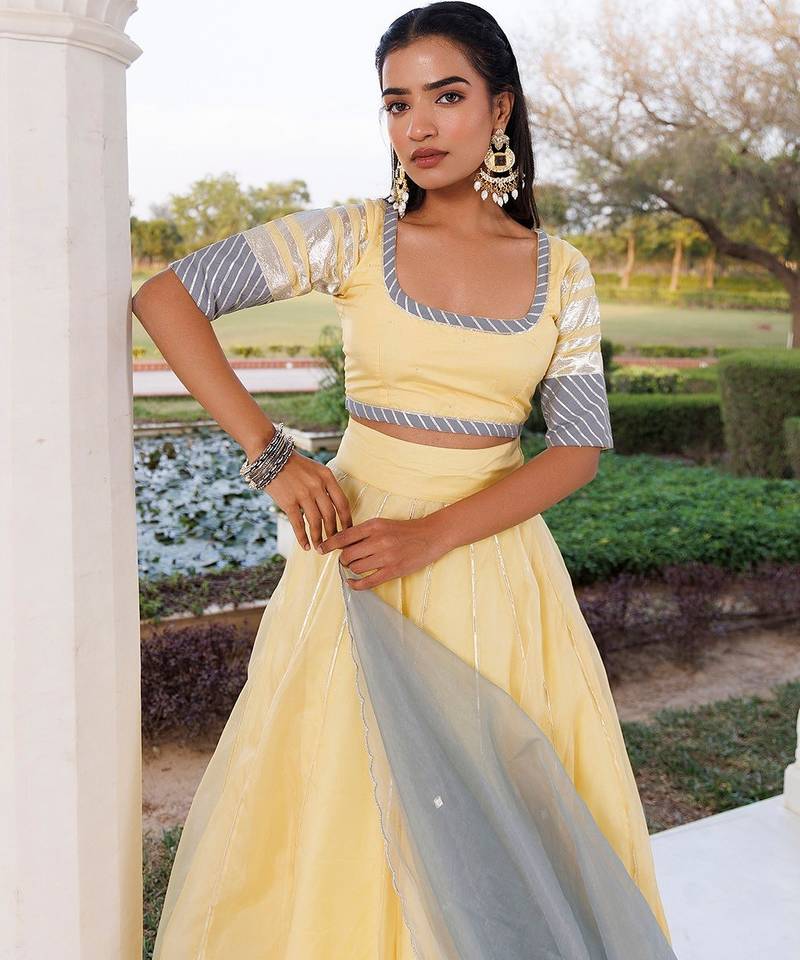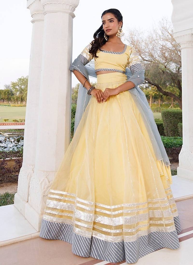| Product Description | Discover Our Stunning Yellow And Grey Organza Lehenga And Choli Set, Complemented By A Matching Grey Dupatta. Crafted With Exquisite Detail, The Choli Boasts A Chic Round Neckline And Charming Half Sleeves, Enhanced With Intricate Gota Work Embellishments. Perfect For Festive Celebrations And Parties, This Ensemble Exudes Elegance And Style. Elevate Your Wardrobe With This Vibrant And Sophisticated Outfit, Guaranteed To Turn Heads At Any Event. Flaunt Your Fashion Sense With Our Meticulously Designed Ensemble, Ideal For Creating Unforgettable Moments And Lasting Impressions. |