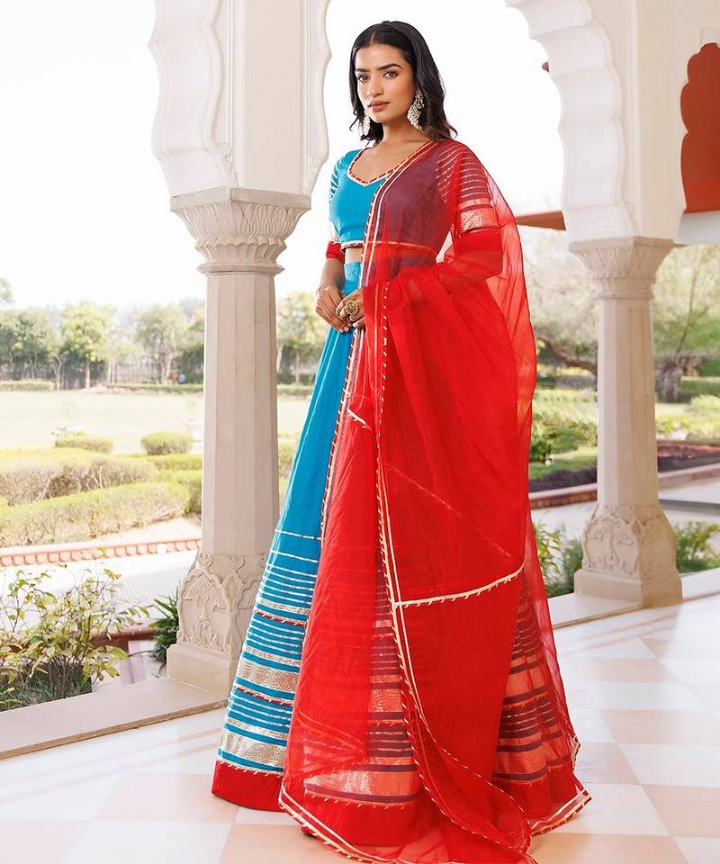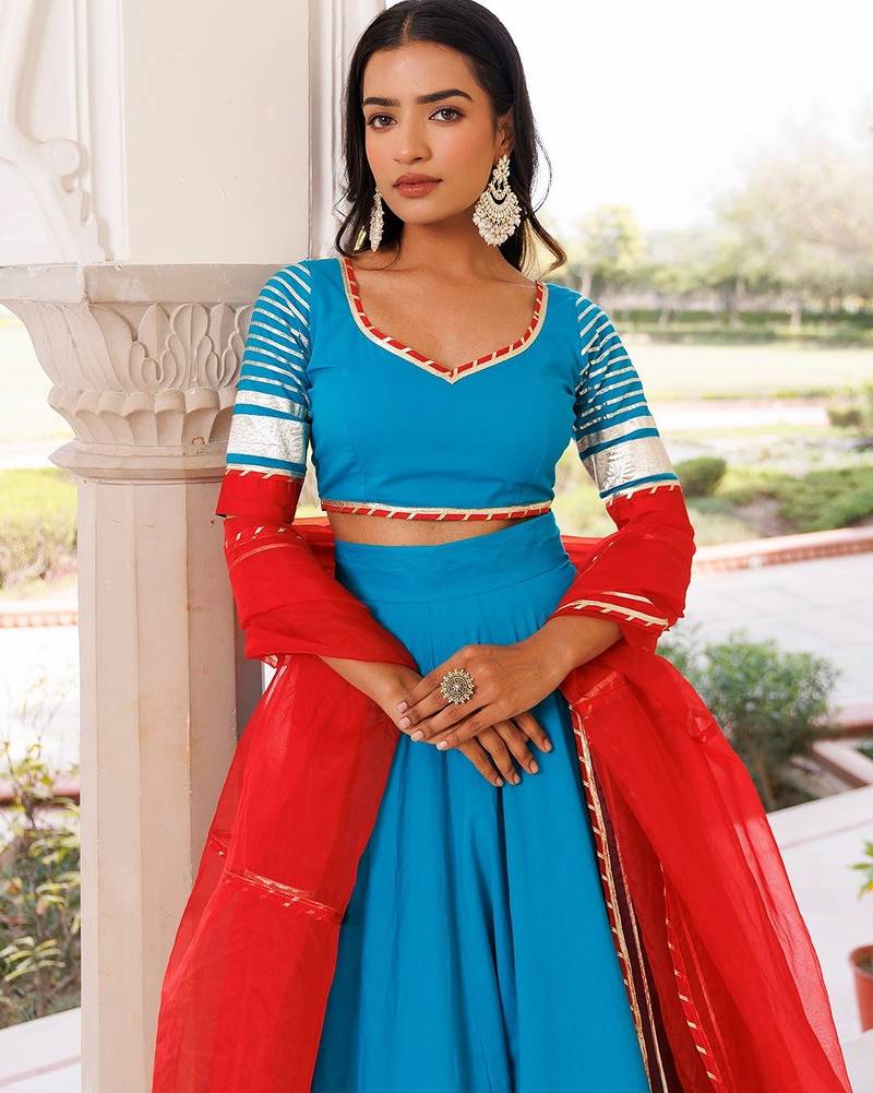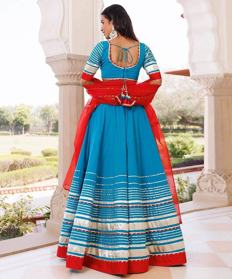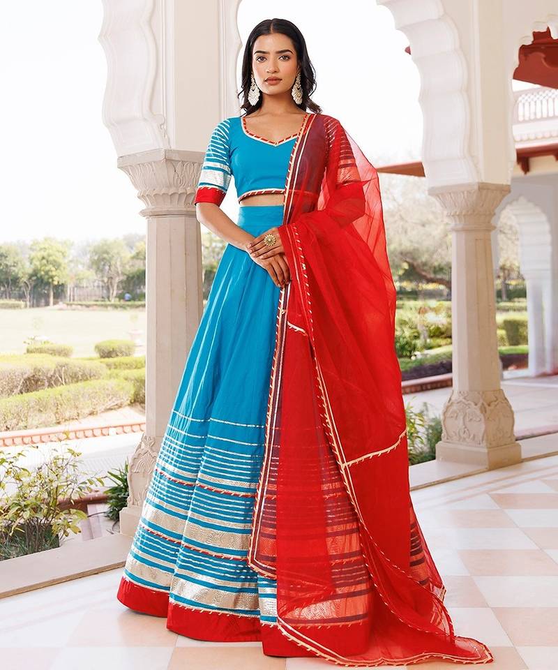 | Product Description | Discover A Stunning Sky Blue Lehenga And Choli Ensemble Crafted From Premium Cotton, Complemented By An Organza Dupatta. The Choli Boasts A Charming Sweetheart Neckline And Delicate Half Sleeves, Enhanced With Exquisite Gota Work Details. Accentuating This Ensemble Is A Vivid Red Dupatta, Creating A Striking Contrast And Infusing The Outfit With A Vibrant Allure. Perfect For Festive Celebrations And Special Occasions, This Attire Exudes Sophistication And Grace, Ensuring A Memorable And Fashionable Statement Wherever You Go. Elevate Your Style With This Chic Ensemble That Combines Traditional Charm With Contemporary Elegance. |