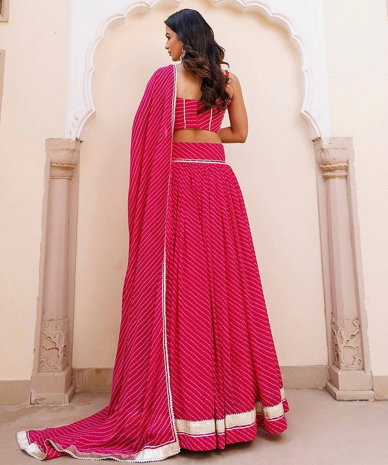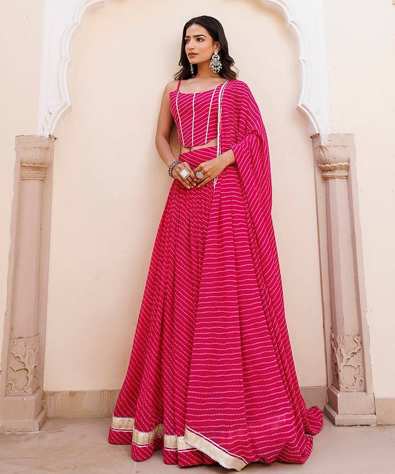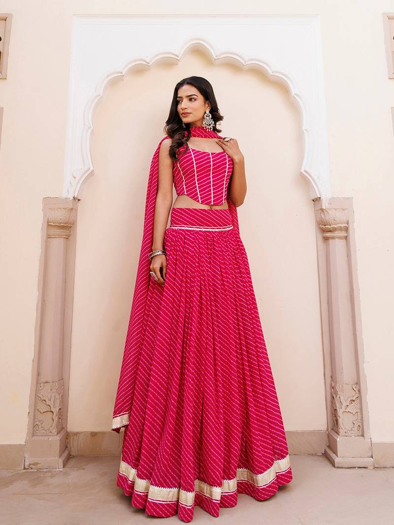 | Product Description | Discover Our Exquisite Pink Georgette Lehenga And Choli Set, Complete With A Matching Dupatta. Crafted With Intricate Gota Patti Work And Leheriya Detailing, The Sleeveless Choli Boasts A Chic Round Neckline. Ideal For Celebratory Events And Gatherings, This Ensemble Exudes Elegance And Charm With Its Vibrant Hue And Traditional Design Elements. Elevate Your Style Quotient And Make A Statement At Any Occasion With This Stunning Outfit. |