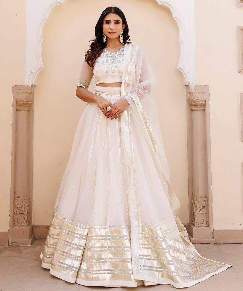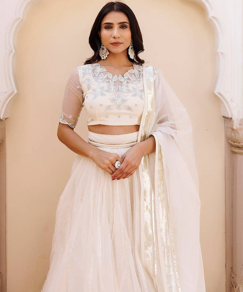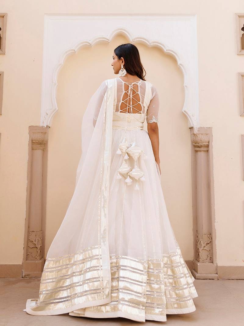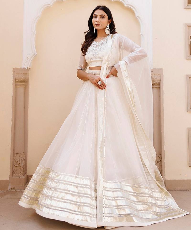 | Product Description | Discover The Epitome Of Elegance With Our Exquisite White Organza Lehenga Set, Complete With A Mesmerizing Choli And Dupatta. Crafted To Perfection, The V Neck Choli Boasts Delicate Half Sleeves Adorned With Intricate Embroidery And Captivating Gota Work. The Ensemble's Heavy Choli Accentuates Its Opulent Detailing, Promising A Regal Charm That Captivates Onlookers. Ideal For Festive Gatherings And Soirées, This Ensemble Exudes Sophistication And Grace With Its Pristine White Hue And Ornate Design. Elevate Your Style Quotient Effortlessly With This Ethereal Creation, Perfect For Making A Statement At Any Celebration. |