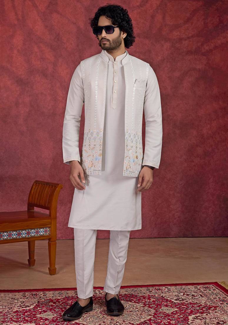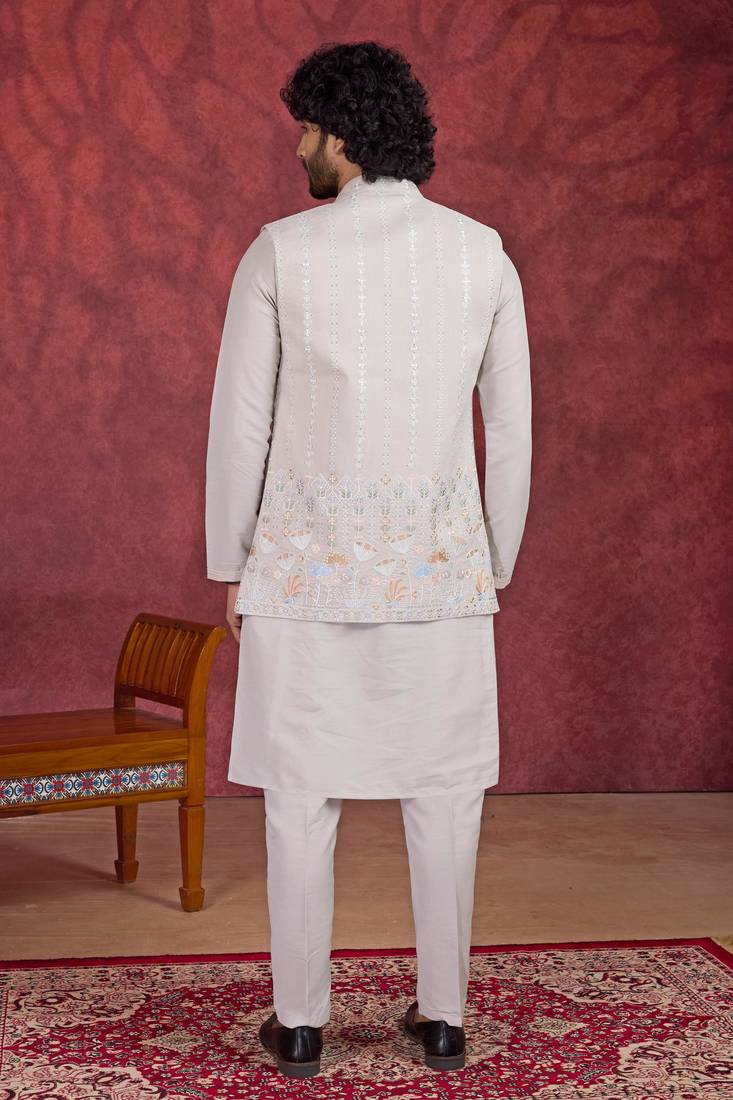 | Product Name | Grey Art Silk 3 Peice Kurta Jacket Set For Men | |