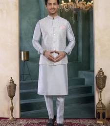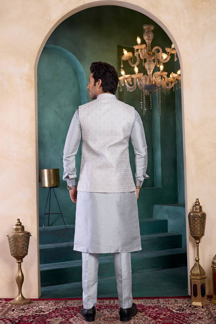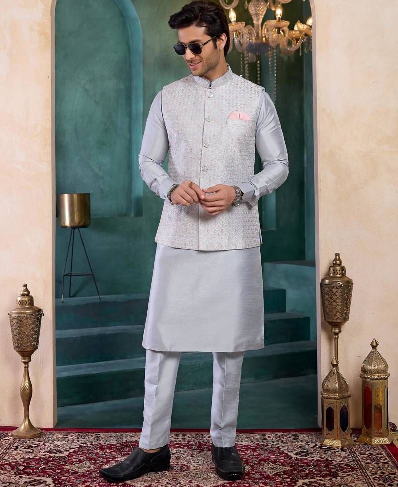 | Product Name | Grey Art Silk 3 Piece Kurta Nehru Jacket Set For Men | |