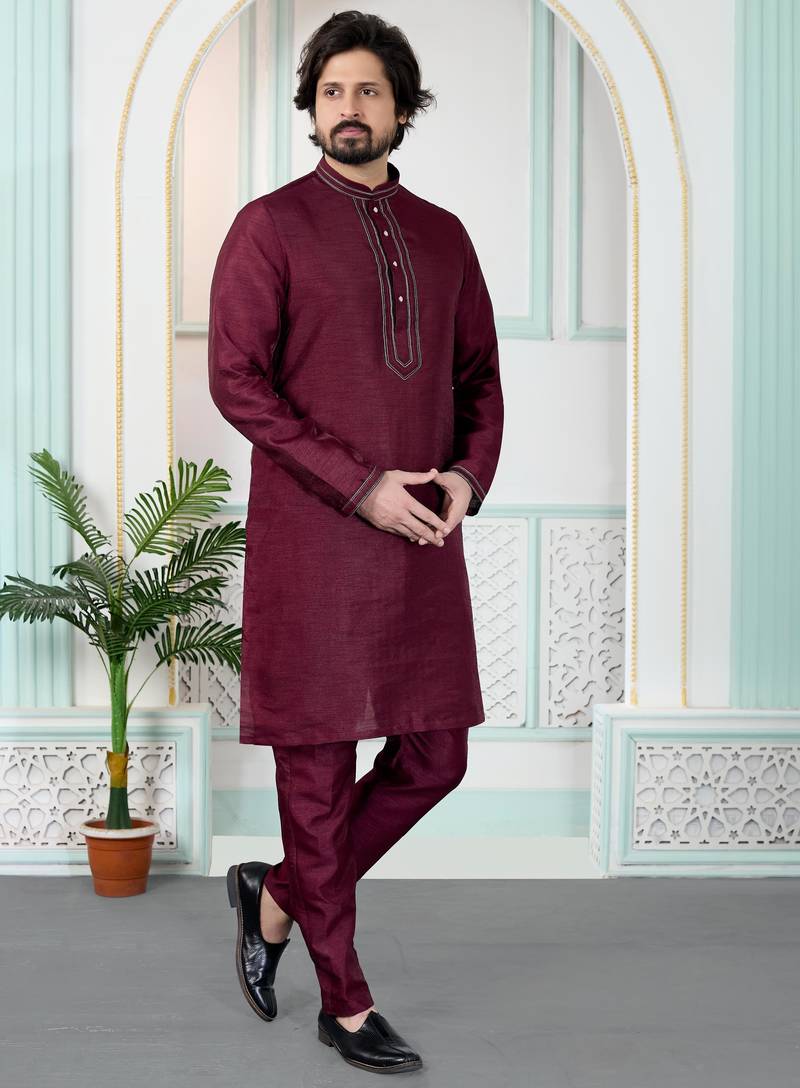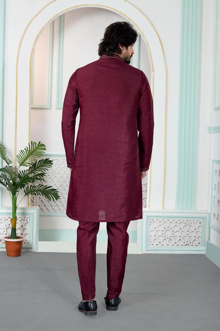Maroon art silk straight kurta for men