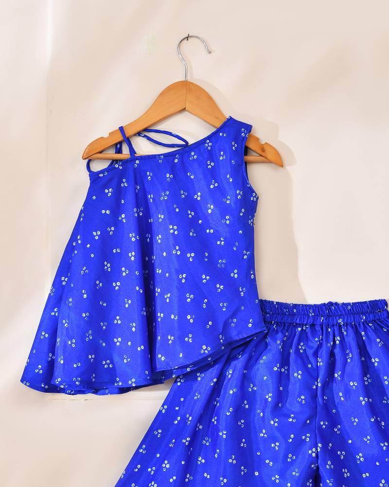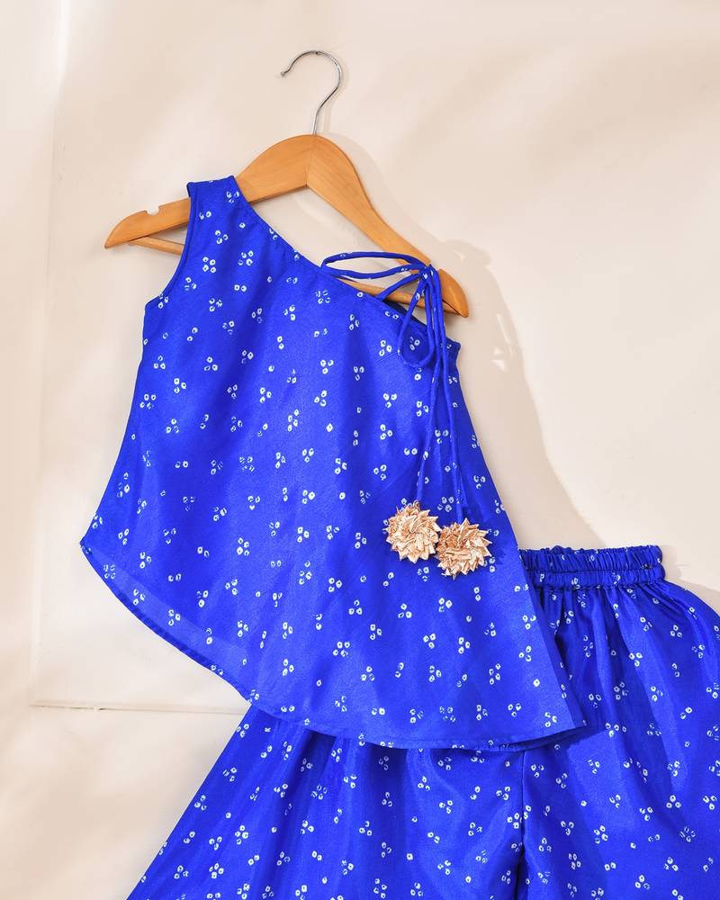 | Product Description | A Stylish Blue Bandhani Inspired Top And Palazzo Set Crafted In Soft, Breathable Fabric. Featuring Delicate White Prints, An Adjustable Tie Up Neckline, A Comfortable Elasticated Waistband, And A Relaxed Fit—Perfect For Festive Occasions, Celebrations, And All Day Comfort For Little Ones. |