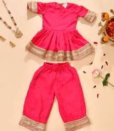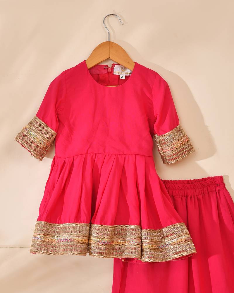 Bright Pink Festive Kurta & Palazzo Set For Kids. Add A Pop Of Celebration To Your Little One’s Wardrobe With This Charming Pink Kurta And Palazzo Set. Designed For Comfort And Festive Flair, The Kurta Features A Graceful Flared Silhouette With Elegant Gold Toned Lace Detailing On The Sleeves And Hemline. Perfectly Paired With Matching Palazzo Pants Highlighted With Coordinated Borders, This Set Offers A Balanced Blend Of Tradition And Ease.