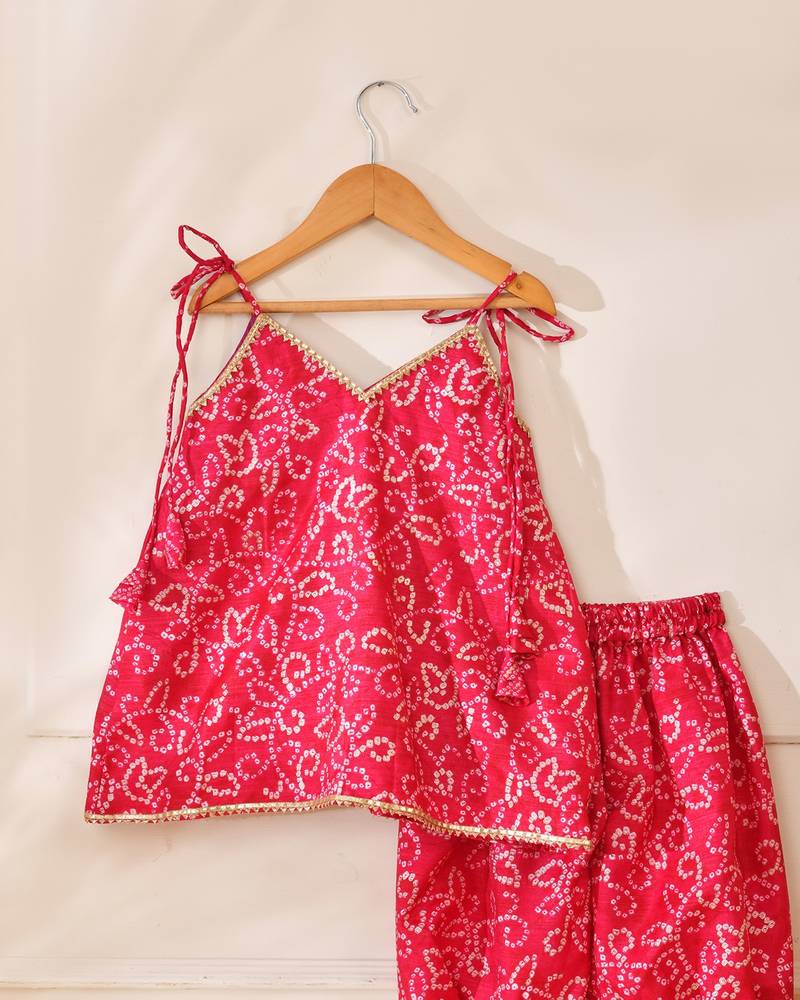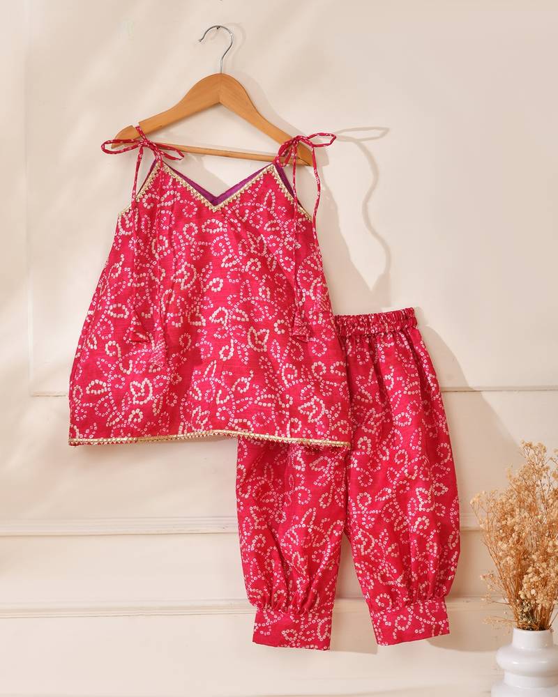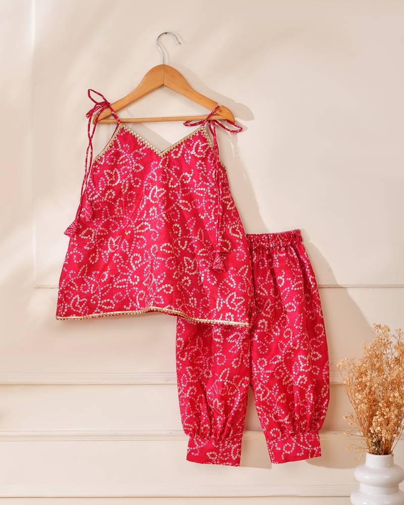 | Product Description | Bring Festive Charm To Your Little One’s Wardrobe With This Vibrant Gulab Red Bandhani Top And Pant Set From Little Panda. Crafted In Soft, Breathable, And Skin Friendly Fabric, This Outfit Is Designed To Keep Your Child Comfortable While Looking Effortlessly Festive. The Sleeveless Top Features Delicate Bandhani Inspired White Print Detailing, Beautifully Contrasted Against The Rich Red Base. Elegant Gold Lace Accents Along The Neckline And Hem Add A Subtle Festive Shimmer, Enhancing The Traditional Appeal. Adjustable Shoulder Tie Ups Ensure A Comfortable And Flexible Fit. Paired With Matching Elasticated Pants, The Set Allows Easy Movement And All Day Wear Comfort, Making It Perfect For Active Little Ones. Ideal For Festivals, Weddings, Birthday Celebrations, And Family Functions, This Ensemble Blends Tradition With Playful Ease. |