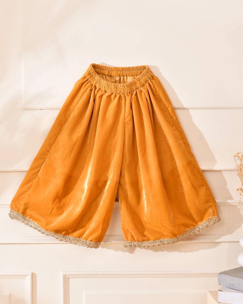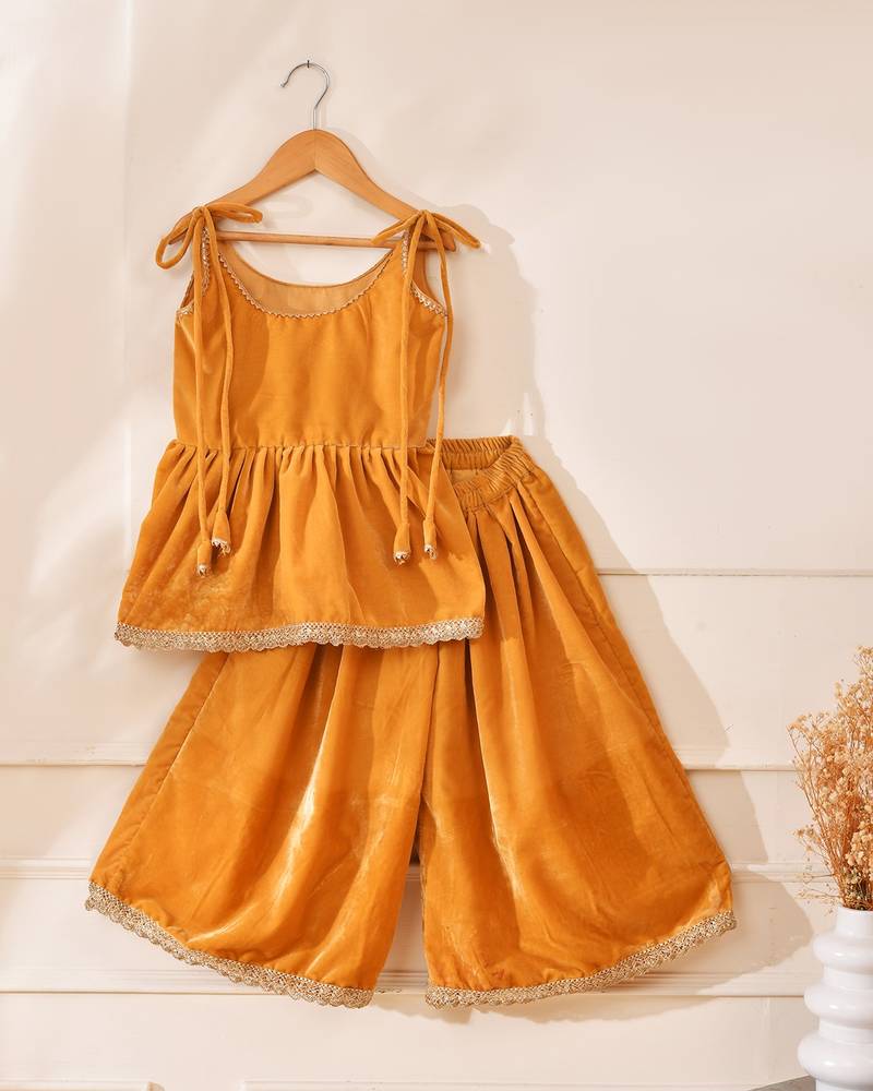 | Product Description | A Graceful Velvet Top And Palazzo Set In Rich Amber Gold, Featuring Delicate Lace Detailing, Adjustable Shoulder Tie Ups, And A Comfortable Elasticated Waistband. Soft, Luxurious, And Perfect For Festive Occasions, Weddings, And Special Celebrations. |