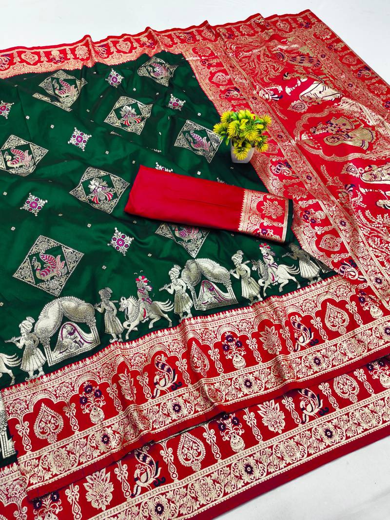 Dark green zari woven art silk baluchari saree with blouse