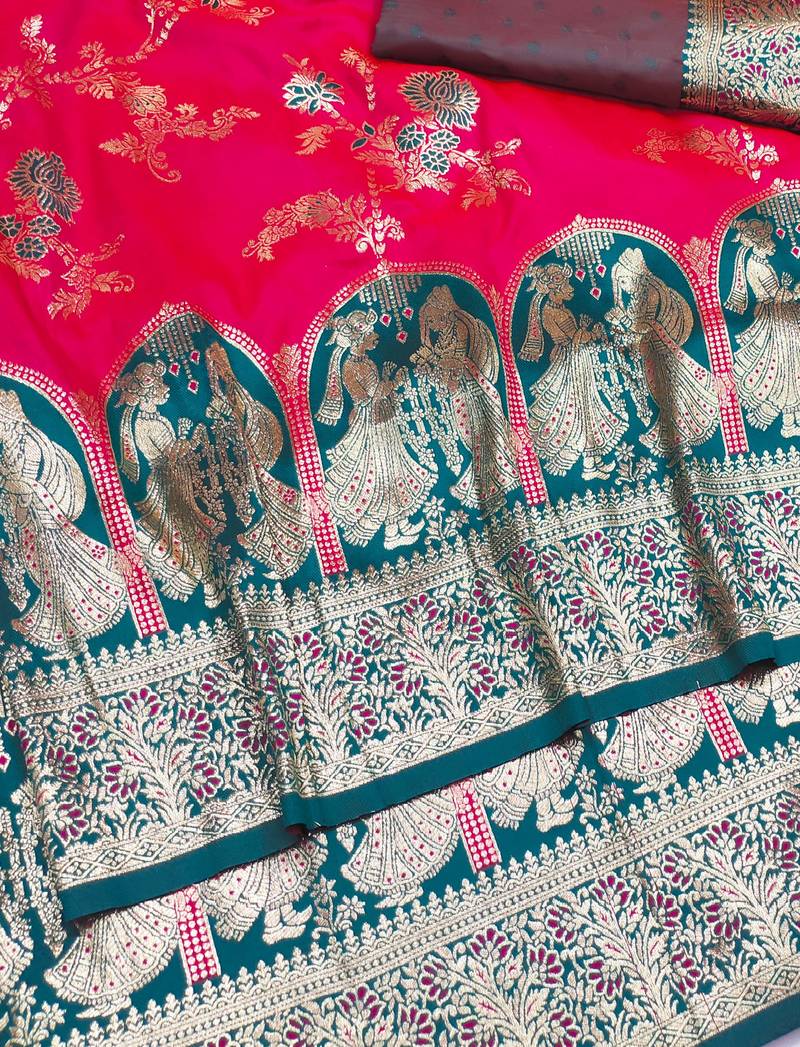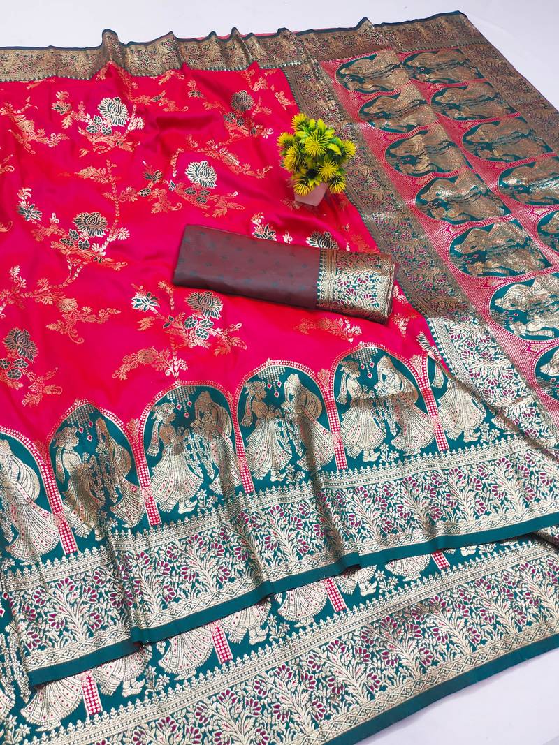 Rani pink zari woven art silk bridal style premium saree with blouse