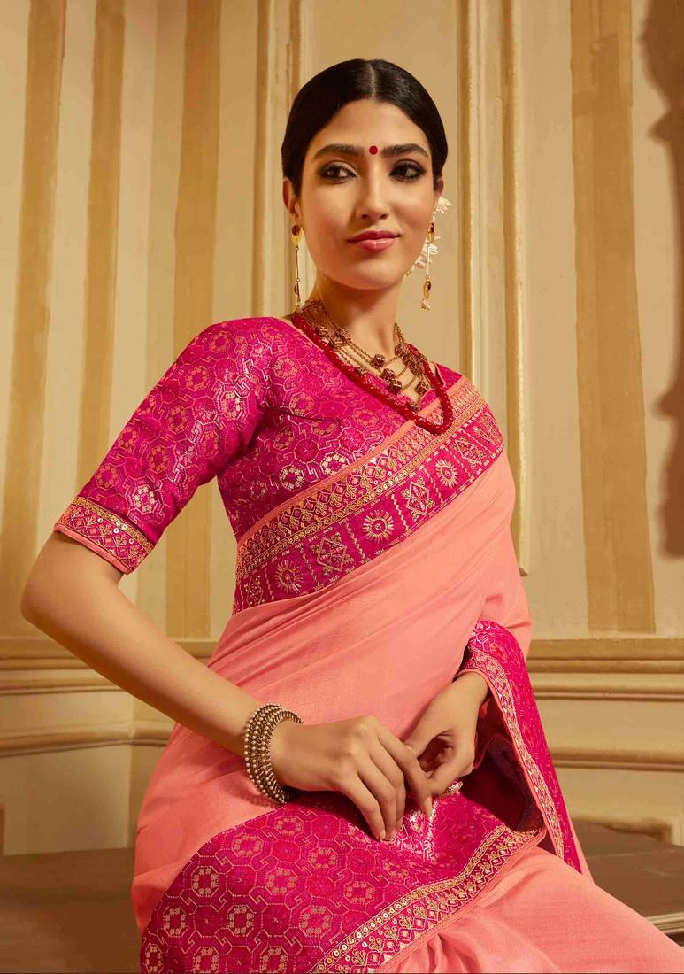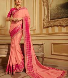 Peach embroidered silk blend saree with blouse