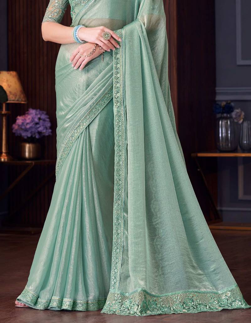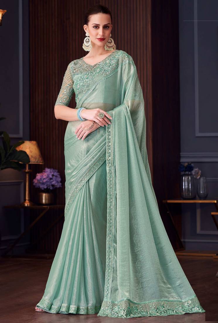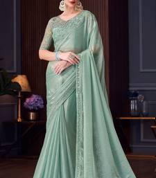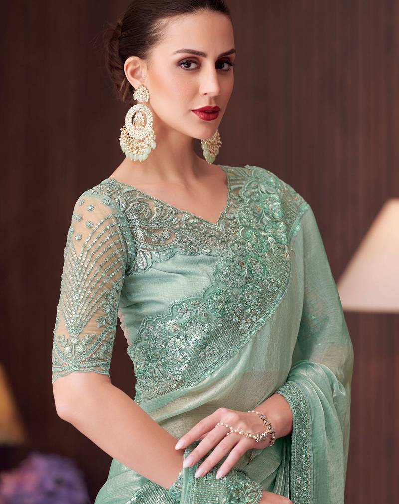 Sea green silk blend embroidered party-wear-sarees