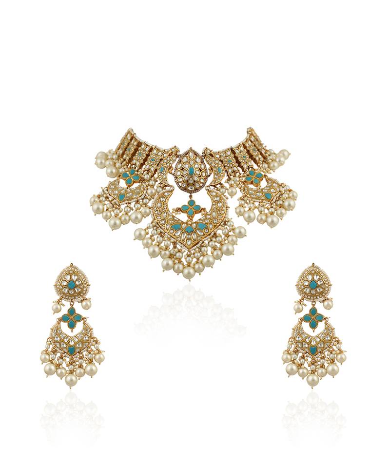 | Product Description | Featuring White And Firozi Heavy Necklace Set With Pearls. |