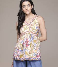 This Multicolor Cotton Top Features Printed Work Across A Soft And Breathable Fabric. The Cotton Material Ensures Comfort For Everyday Wear And Casual Outings. The Sleeveless Design Offers A Relaxed And Easy Fit. The Printed Pattern Adds Visual Detail While Maintaining A Clean And Structured Appearance. The Stitched Construction Ensures A Ready To Wear Form. The Multicolor Shade Supports Versatile Styling With Different Bottoms, Making It Suitable For Casual And Festive Occasions.
