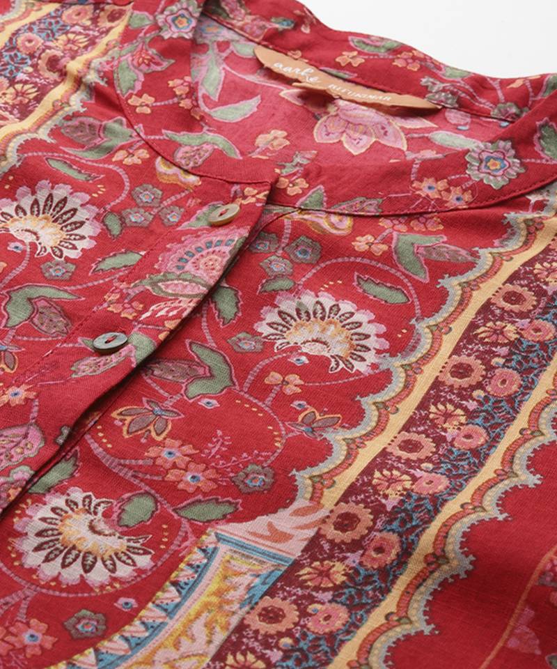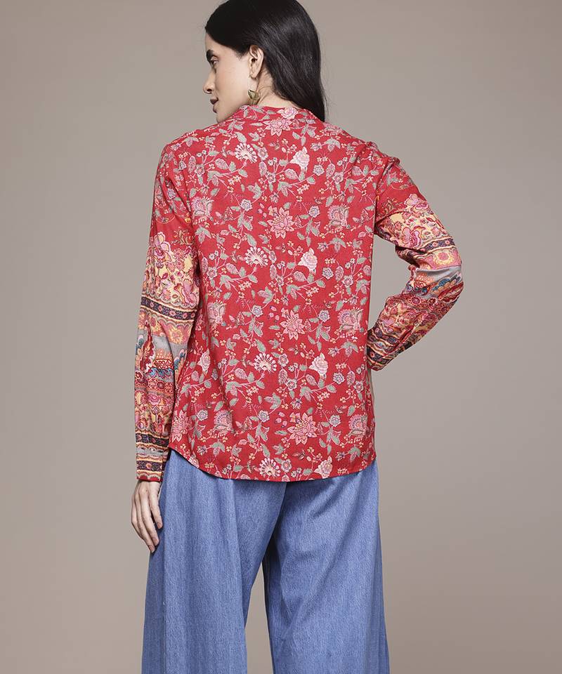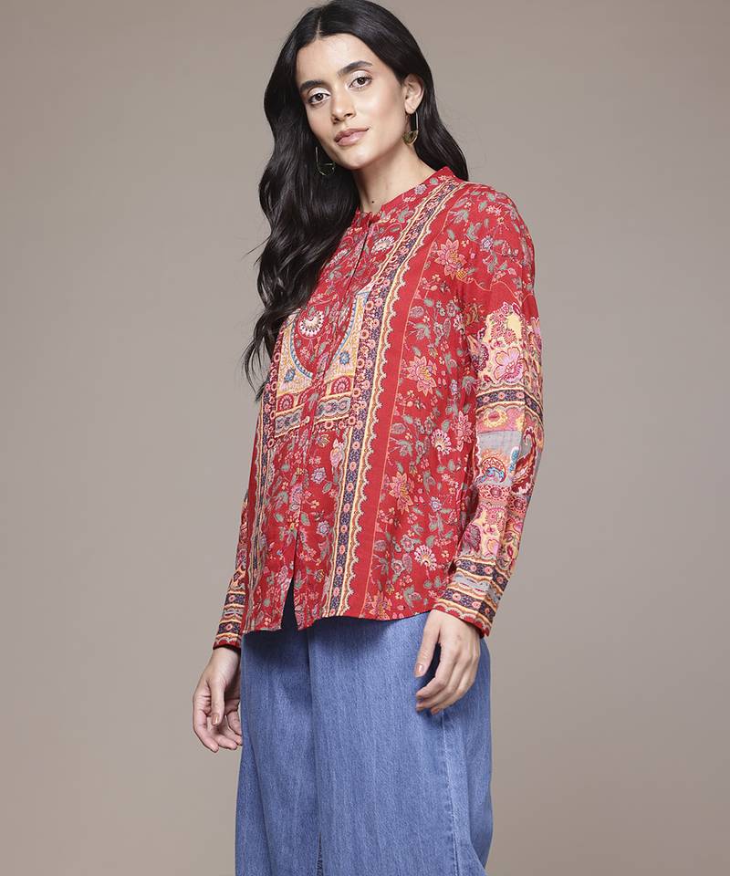 Red rayon shirt with printed work design