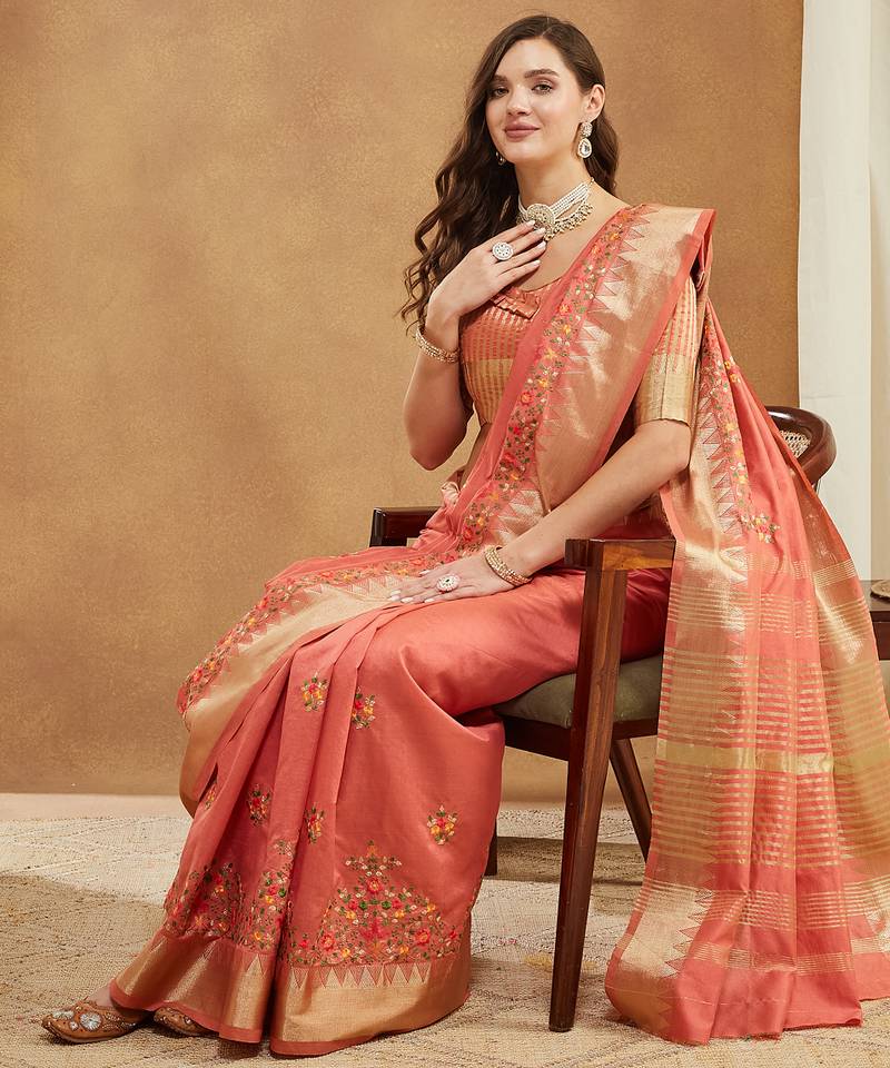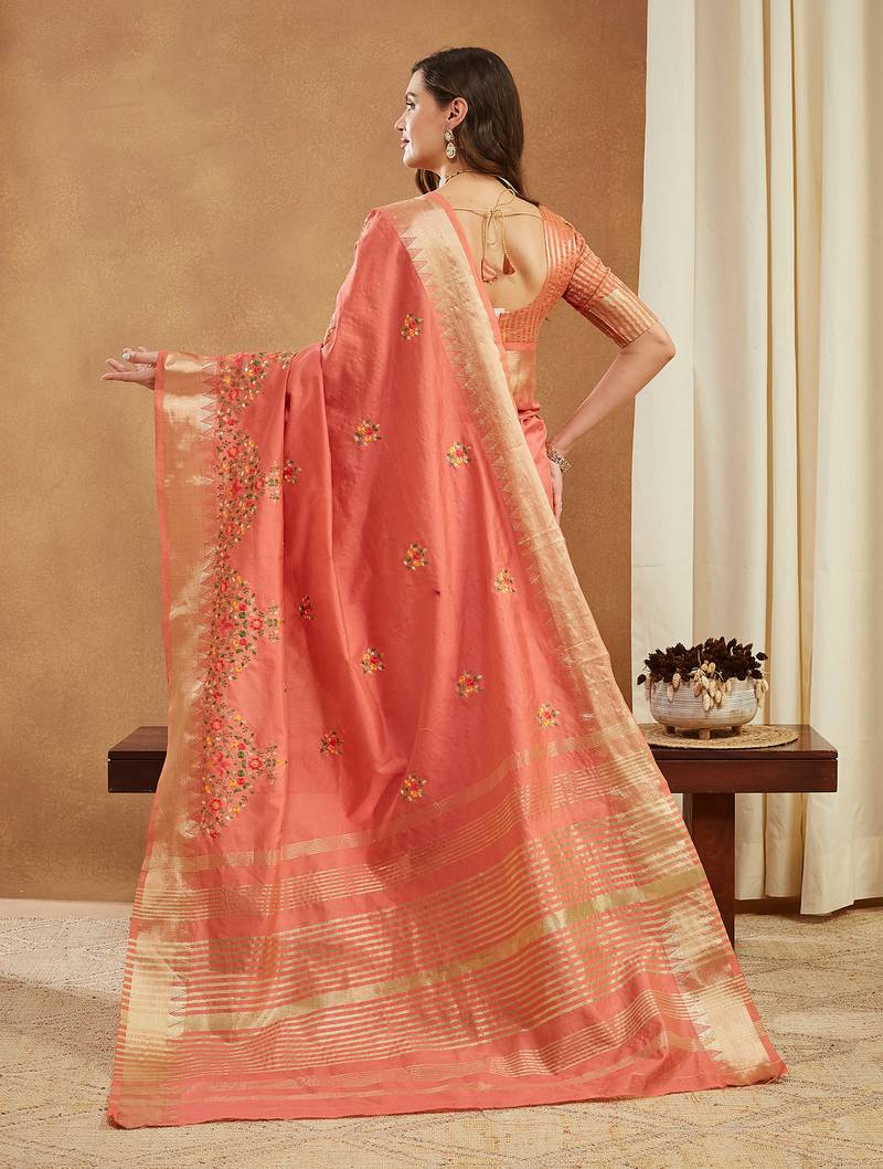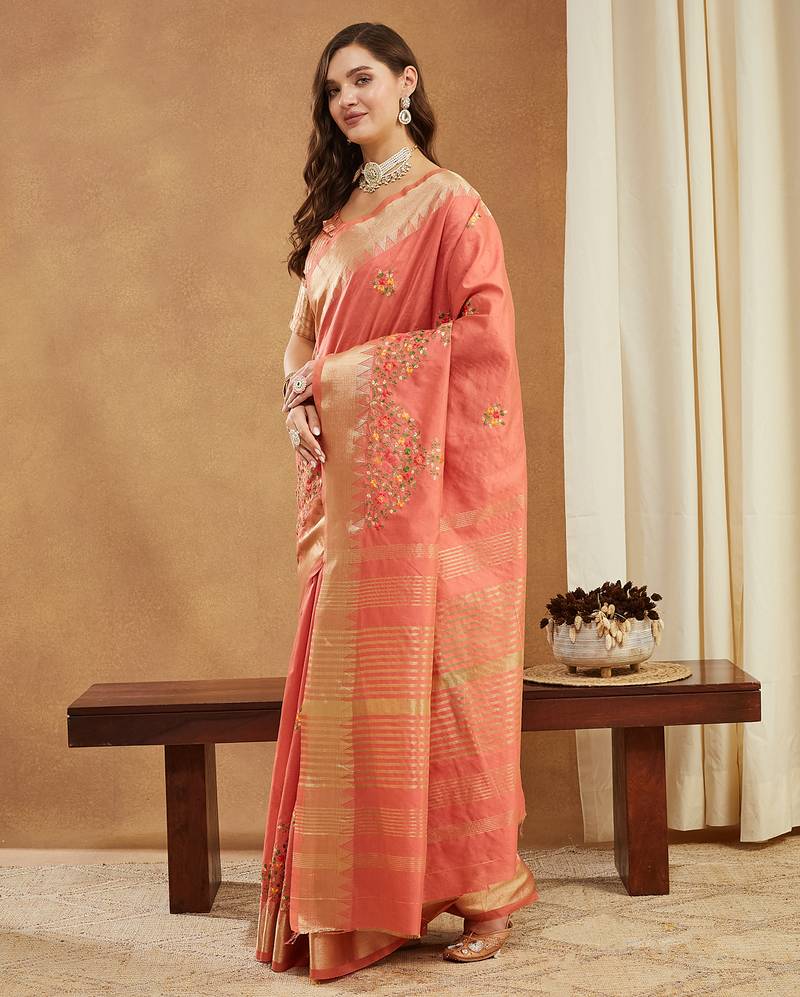 | Product Name | Peach Assam Cotton Silk Saree With Multicolor Embroidery | |