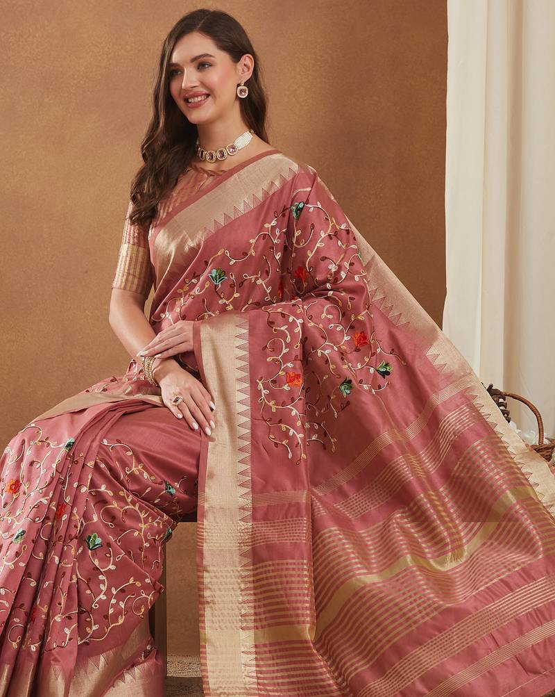 Assam cotton art silk embroidered zari temple border saree with blouse.