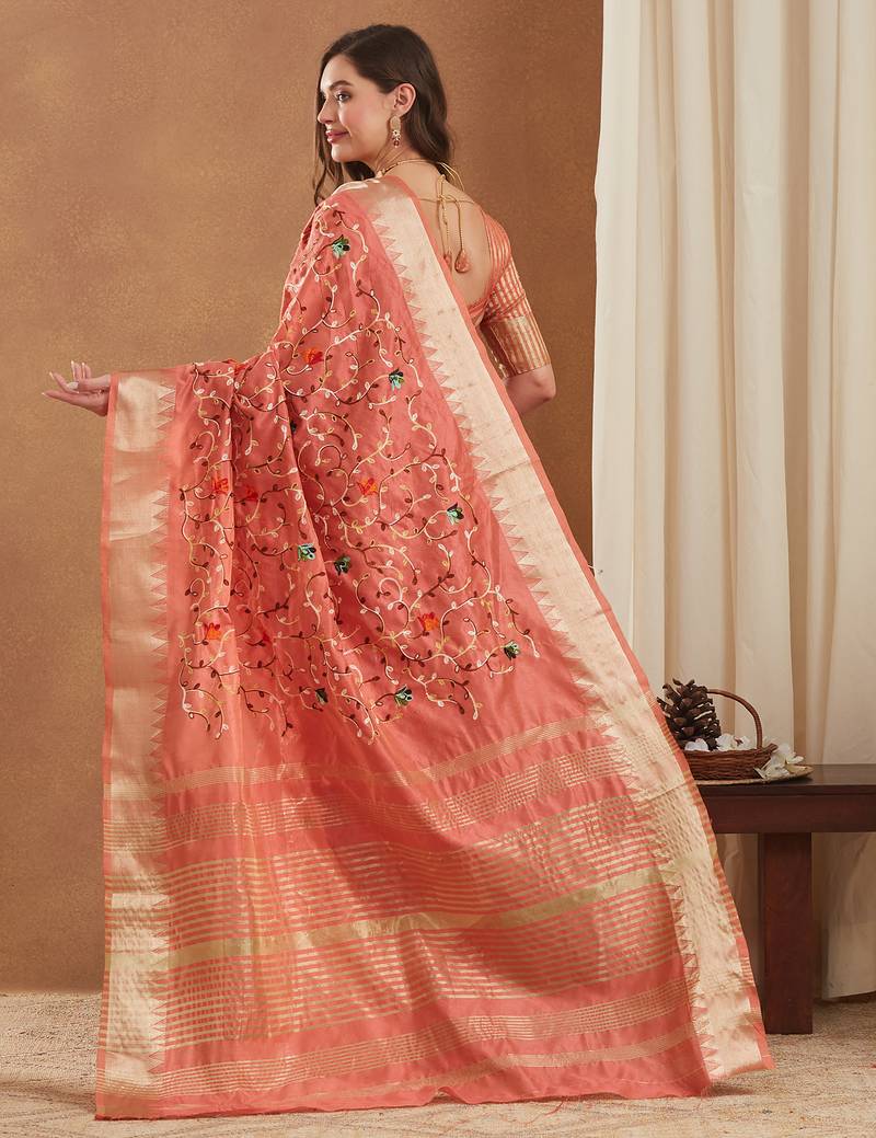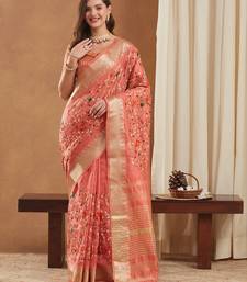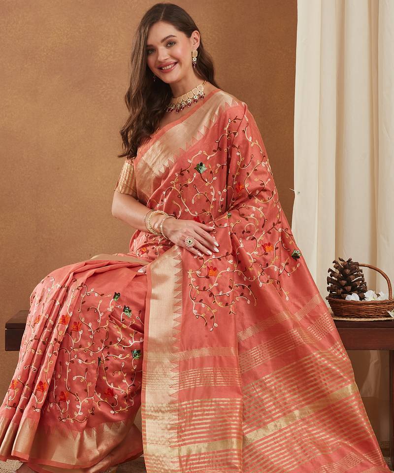 | • | Saree | : | Color- Peach / Fabric- Cotton |