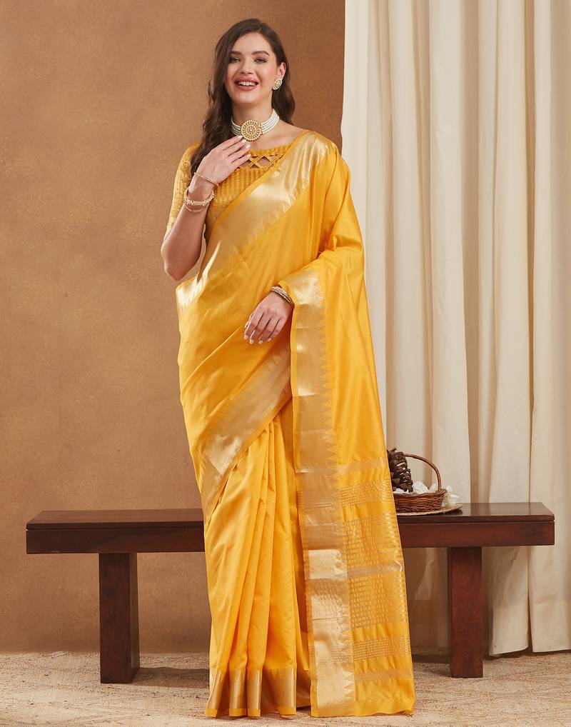 | Product Description | Crafted From Premium Assam Silk Fabric, This Saree Showcases A Rich Printed Design Paired With An Elegant Golden Zari Temple Contrast Border That Adds A Touch Of Traditional Grandeur. The Luxurious Texture Of Assam Silk Combined With The Vibrant Pattern Ensures A Sophisticated Festive Look. It Comes With A Matching 0.8 Meter Unstitched Blouse Piece In Assam Silk, Allowing You To Tailor It Perfectly To Your Preferred Style. This Saree Delivers A Graceful Drape And Timeless Aesthetic Ideal For Every Special Occasion. |