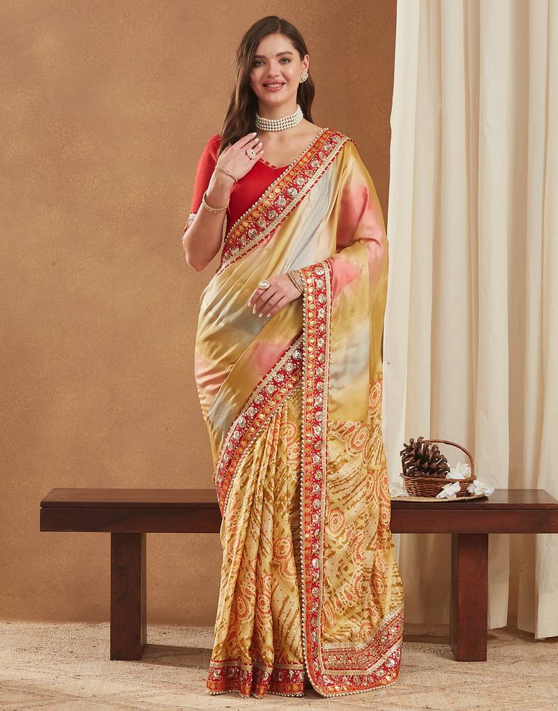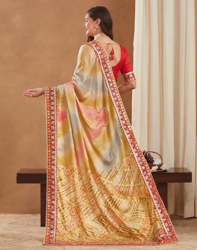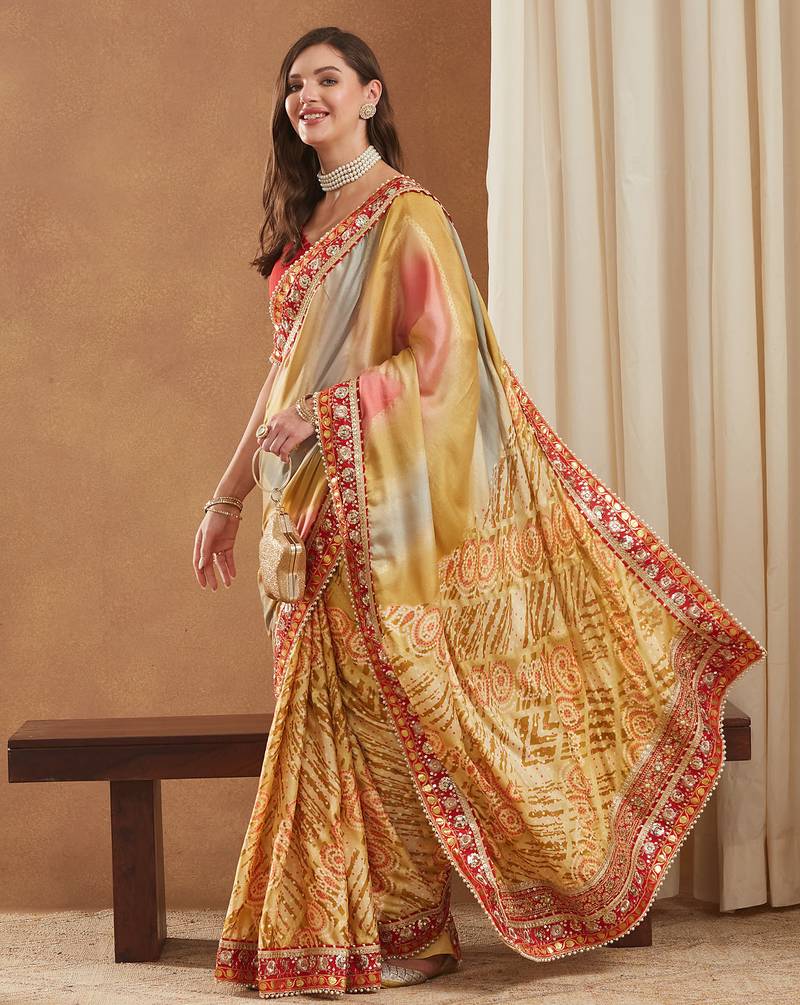 | Product Description | This Stunning Saree Is Crafted From Bright Mose Chiffon, Known For Its Lightweight And Graceful Drape. Designed In A Stylish Half And Half Concept, One Side Features An Elegant Printed Pattern While The Other Showcases A Vibrant Traditional Bandhani Print, Enhanced With Dazzling Foil Detailing. The Saree Is Beautifully Finished With A Multilayered Lace Border And Golden Gotta Patti Lace, Adding An Exquisite Festive Glow. It Includes An Unstitched Banglori Silk Blouse Piece (0.8 M Approx.) For Customized Tailoring, Making It A Perfect Choice For Exclusive Celebrations And Partywear Looks. |