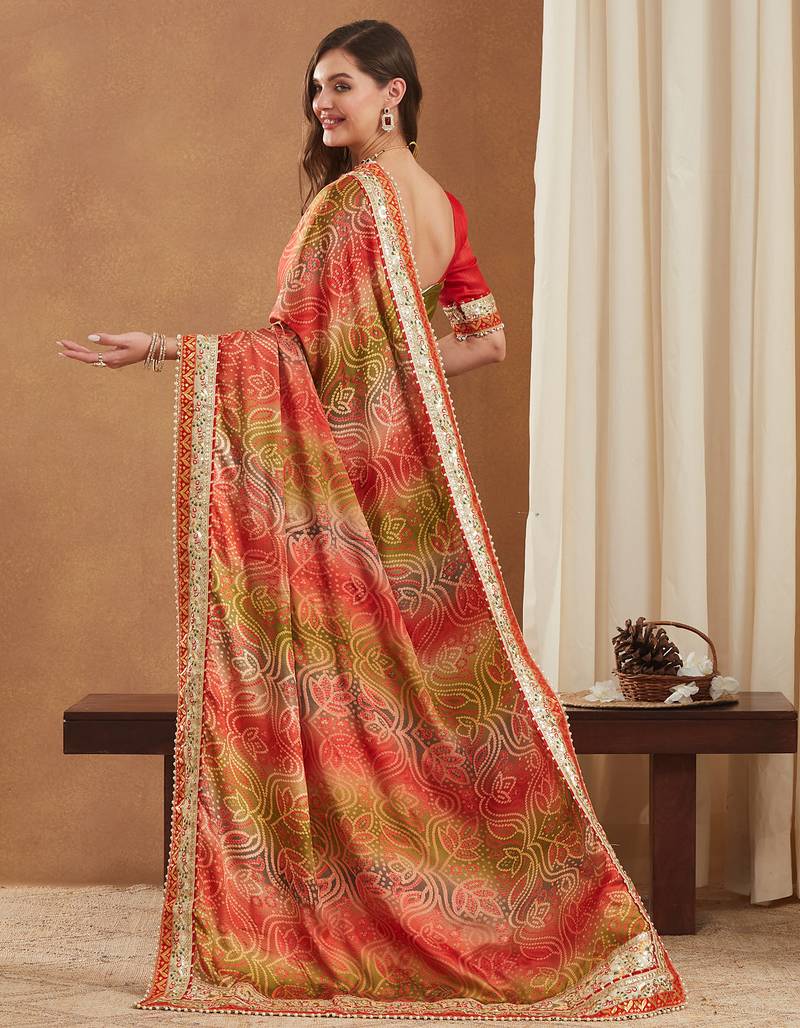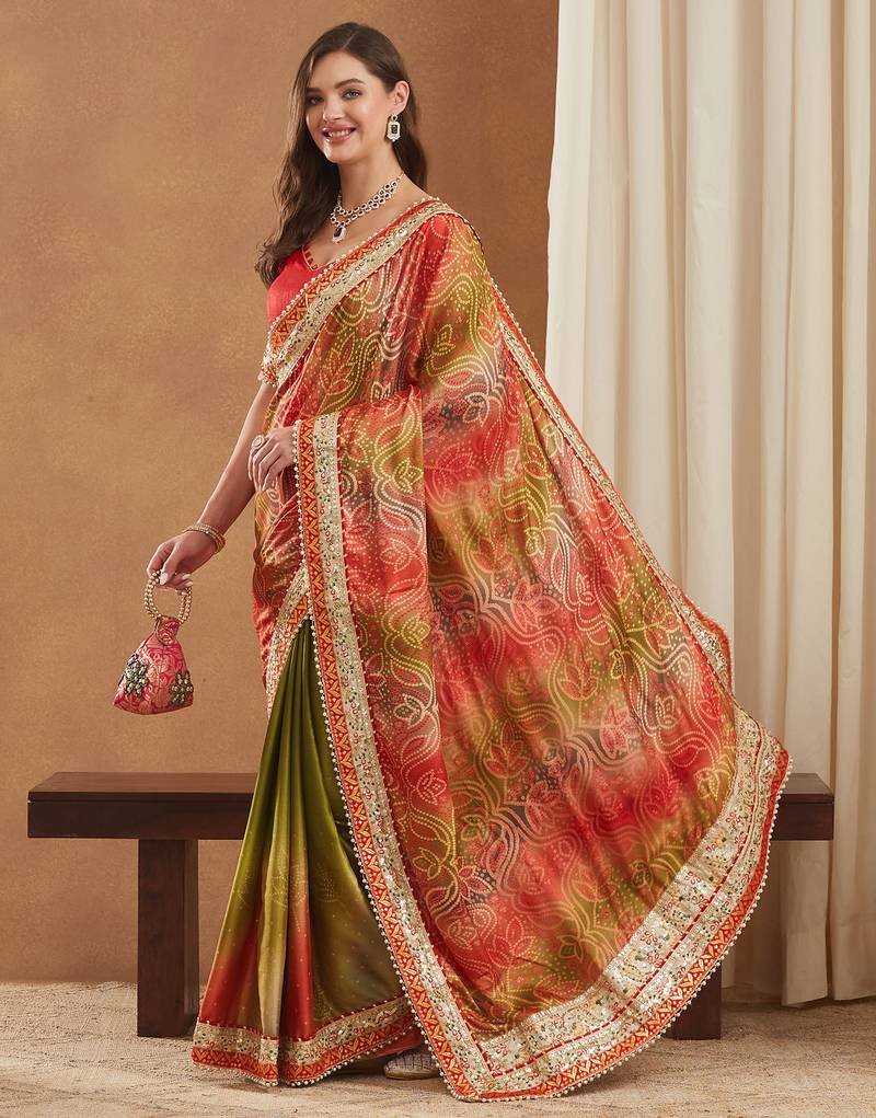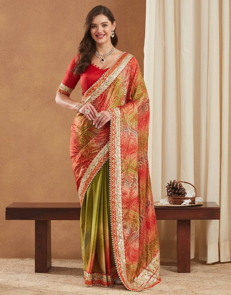 | Product Description | This Stunning Saree Is Crafted From Bright Mose Chiffon, Known For Its Lightweight And Graceful Drape. Designed In A Stylish Half And Half Concept, One Side Features An Elegant Printed Pattern While The Other Showcases A Vibrant Traditional Bandhani Print, Enhanced With Dazzling Foil Detailing. The Saree Is Beautifully Finished With A Multilayered Lace Border And Golden Gotta Patti Lace, Adding An Exquisite Festive Glow. It Includes An Unstitched Banglori Silk Blouse Piece (0.8 M Approx.) For Customized Tailoring, Making It A Perfect Choice For Exclusive Celebrations And Partywear Looks. |