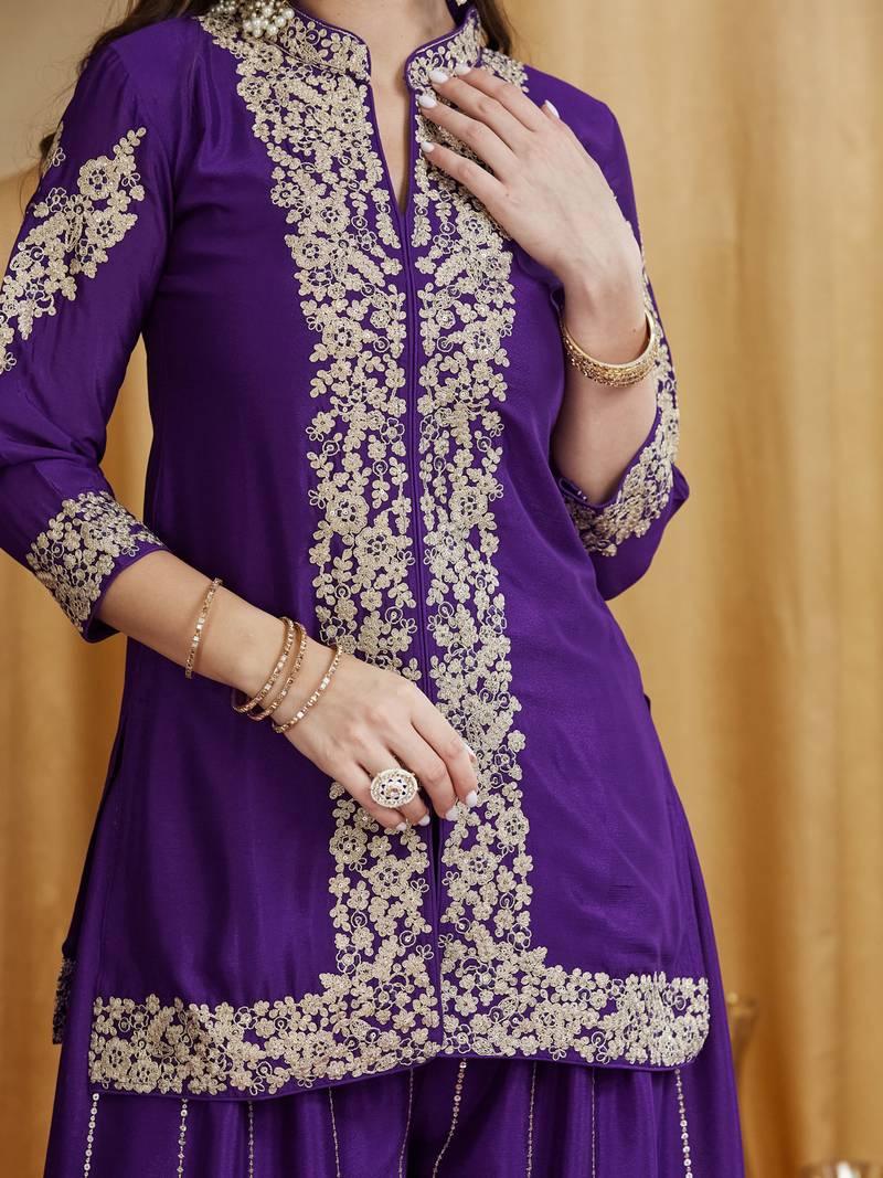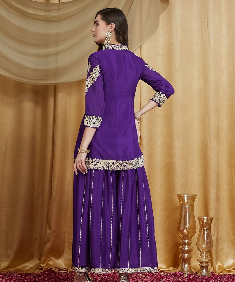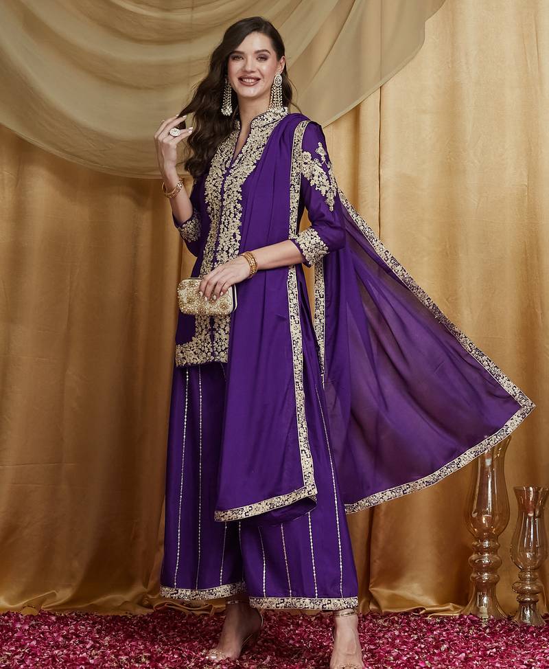 | Product Description | This Stunning Ethnic Ensemble, Crafted From Rich Chinon Fabric, Is A Perfect Blend Of Elegance And Festive Grandeur. The Set Includes A Beautifully Embroidered Kurta, Flared Palazzo Pants, And A Matching Dupatta — All Featuring Intricate Cording, Thread, And Sequin Embroidery Work. The Kurta Is Styled With A Sophisticated Mandarin Neckline And 3/4th Sleeves, And Showcases Exquisite Embroidery Detailing On The Neckline, Sleeves, And Hemline. Designed With Both Side And Front Slits, This Above Knee Length Kurta Also Includes A Full Inner Lining For Enhanced Comfort And Structure. The Flared Palazzo Bottom, Also Made From Chinon Fabric, Features Matching Embroidery And Full Lining, Adding A Regal And Graceful Flow To The Silhouette. The Coordinated 2.25 Meter Dupatta Completes The Look With Lace Detailing And Elegant Embroidery, Making It An Eye Catching Addition To The Outfit. Ideal For Festive Occasions, Weddings, And Traditional Celebrations, This Stitched Chinon Kurta Set Radiates Charm, Sophistication, And Timeless Ethnic Beauty. |