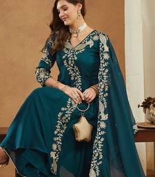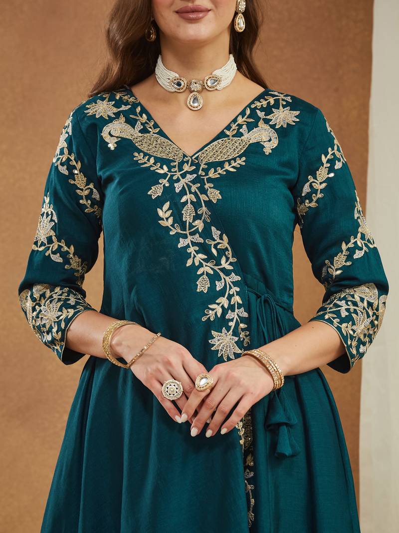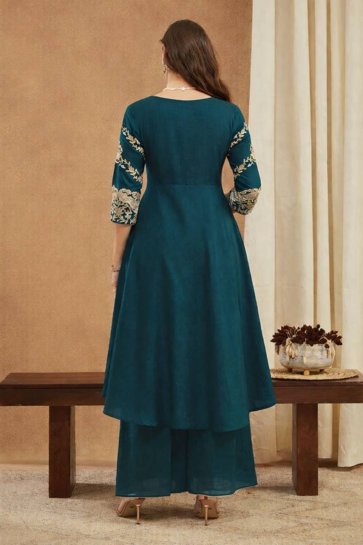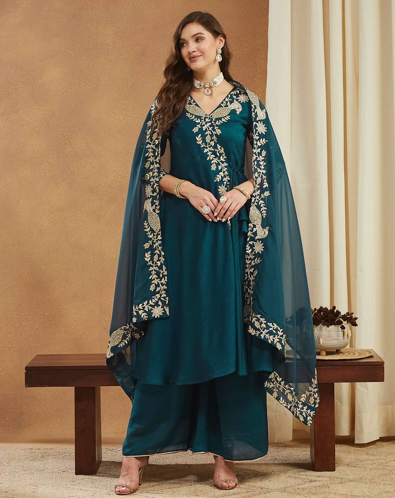 This Exquisite Three Piece Ensemble Is Crafted With A Luxurious Blend Of Vichitra Silk And Organza, Offering A Perfect Combination Of Elegance, Comfort, And Grandeur. The Kurta, Made From Premium Vichitra Silk, Features A Flared Angrakha Anarkali Silhouette That Exudes A Royal And Flowy Charm. It Is Adorned With Intricate Zari Threadwork And Sequin Embroidery On The Front Panel, Along With A Stylish V Neckline And Detailed Hemline, Creating A Regal And Flattering Look. The Bottom Is Designed With Flared Palazzo Pants In Matching Vichitra Silk, Enhanced With Piping Lace Detailing For A Refined Finish And Effortless Movement. Completing The Look Is A Lightweight, Sheer Organza Dupatta, Beautifully Embroidered With Zari Sequins And Finished With Delicate Piping Lace For An Ethereal, Shimmering Effect. This Ready To Wear Outfit Is Ideal For Weddings, Festivals, Gatherings, And Celebratory Events, Offering A Complete And Polished Look That Captures The Essence Of Traditional Elegance With A Modern Twist.