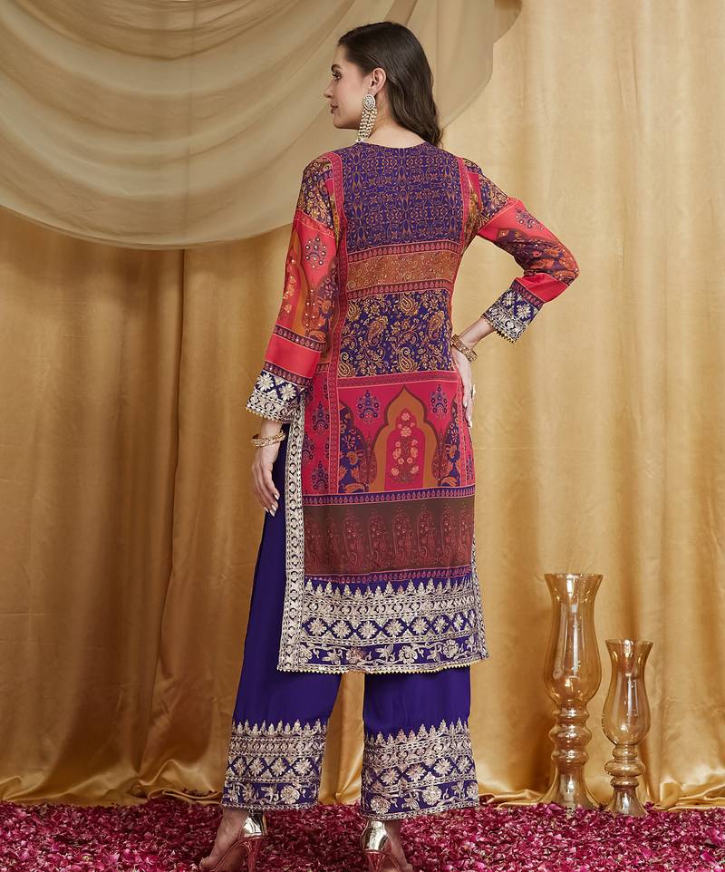 | Product Description | This Elegant Outfit Is Crafted Entirely From Premium Pure Georgette Fabric, Including The Top, Bottom, And Dupatta, Ensuring A Luxurious And Flowing Drape. The Top Features Exquisite Golden Zari Thread Embroidery, Enhanced With Sequins And Detailed Handwork, Beautifully Covering The Entire Front For A Rich And Ornate Appearance. The Bottom, Designed As A Palazzo, Also Showcases Intricate Golden Zari Embroidery, Complementing The Top’s Design. The Dupatta Stands Out With Its Finely Embroidered Cutwork Border, Adding A Graceful Finishing Touch. Styled As A Straight Kurta With Side Slits And Embroidered Sleeves, The Top Comes With A Full Inner Lining For Comfort. The Bottom Is Similarly Lined, Offering Ease And Elegance In Wear. This Ready To Wear Ensemble Is Perfect For Weddings, Gatherings, Festivals, And Special Events, Presenting A Heavy, Extraordinary Look Ideal For Women Who Want To Make A Statement. |