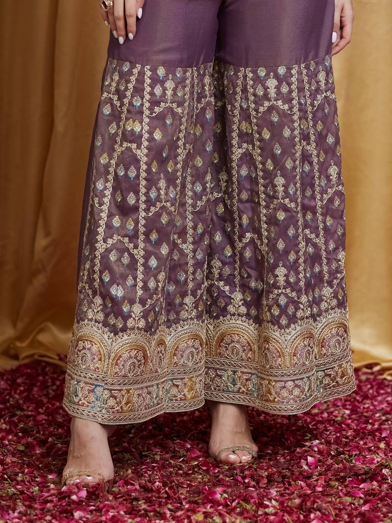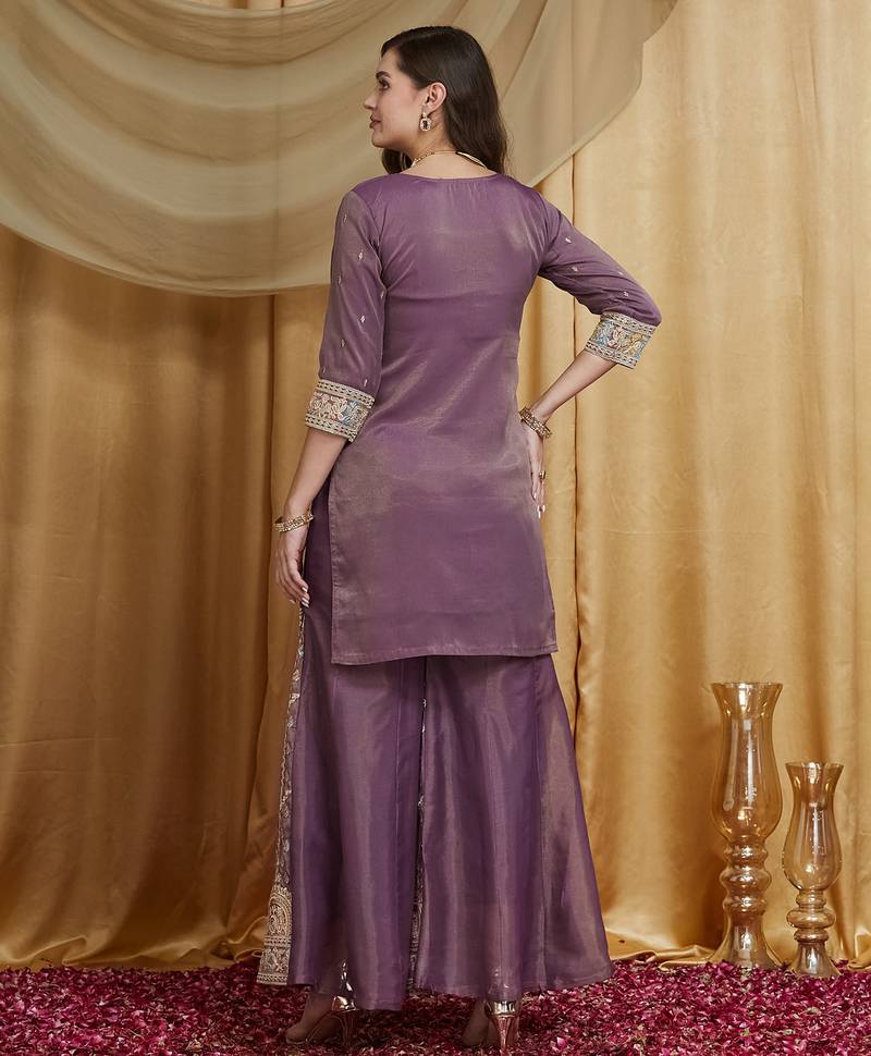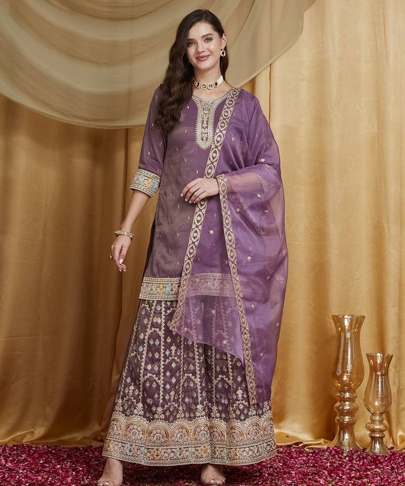 | Product Description | This Graceful Ethnic Set In A Rich Lavender Tone Is Crafted From Luxurious Shimmer Silk Fabric, Designed To Make A Statement At Festive And Traditional Events. The Ensemble Includes A Knee Length Kurta, Flared Palazzo, And A Coordinating Dupatta, All Adorned With Intricate Cording, Multi Colour Thread, And Sequin Embroidery Work That Adds Elegance And A Hint Of Regal Charm. The Kurta Features A Flattering Round Neckline, 3/4th Sleeves, And Detailed Embroidery On The Neck, Sleeves, And Hemline. Side Slits And A Full Inner Lining Enhance The Silhouette While Ensuring All Day Comfort. The Flared Palazzo, Also Fully Lined, Showcases Matching Embroidery With Stunning Borders That Elevate The Ensemble’s Grandeur. Completing The Look Is A 2.25 Meter Dupatta With Matching Embroidered Accents And Lace Detailing, Adding An Elegant Flow And Cohesive Finish. This Stitched Shimmer Silk Set Is Perfect For Weddings, Festive Celebrations, Or Special Occasions, Offering A Perfect Blend Of Traditional Artistry And Modern Style. |
