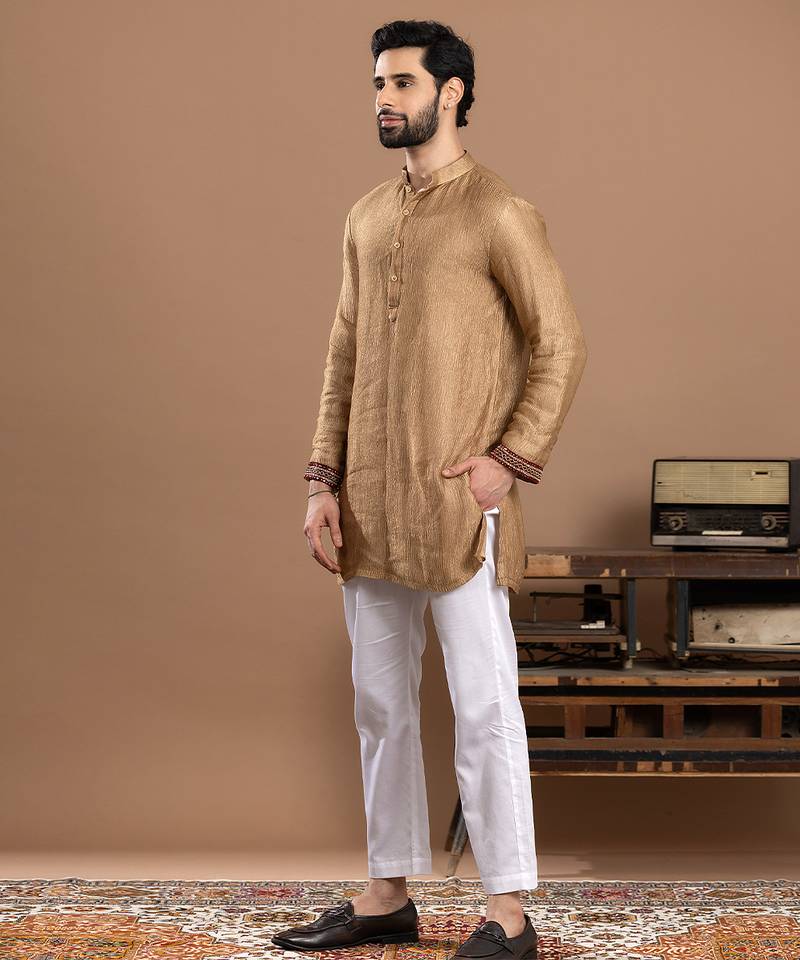 | Product Description | Gold Tissue Kurta Pajama Crafted For A Luminous And Elegant Festive Look. Made From Lightweight Tissue Fabric With A Rich Sheen, It Offers A Graceful Drape And Refined Appeal. Ideal For Weddings, Ceremonies, And Celebrations, This Ensemble Blends Traditional Charm With Sophisticated, Regal Style.