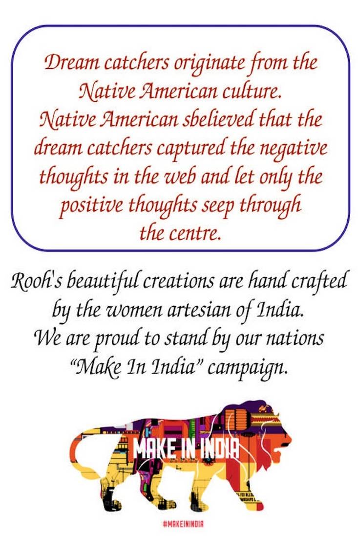 Dream Catchers The Popular Native American Ojibwa Tribecharms Are Hand Woven With The Intention Of Nurturing Your Loved Ones & Bridging Art With Divinity. These Beautiful Looking At Rooh Dream Catchers Are Intended To Protect The Sleeping Individual By Filtering The Negative Vibrations And Bad Dreams To Postives Ones. At Rooh We Stick To The Learning From Ojibwa People Who Use To Make Hand Woven Dream Catchers With All Materials Available In The Nature Such As Twigs, Sinew, Shells, Stones And Feathers To Teach Natural Wisdom To Their Young Ones. At Rooh We Have Taken The Learning A Step Forward And Added Our Knowledge Of Color Psychology And Impact It Can Create To Ones Life. The Color Chosen By You Is The Color That Brings Optimism To Your Life, So Buy The One That Touches Your Soul.