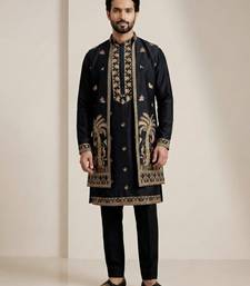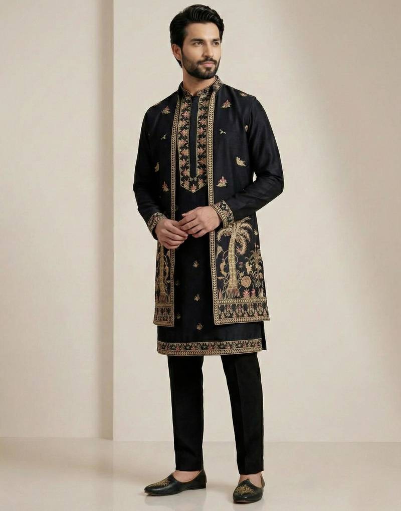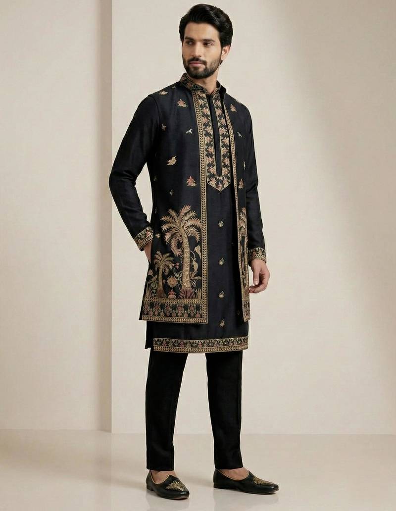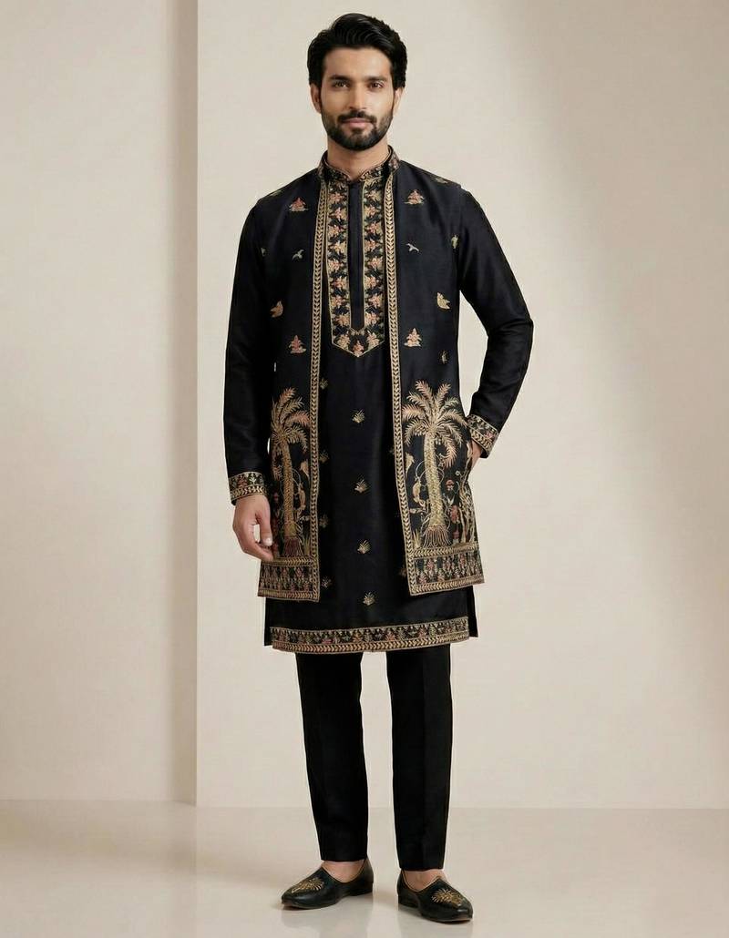 Black doniyar shartin men's kurta pyjama with long jacket