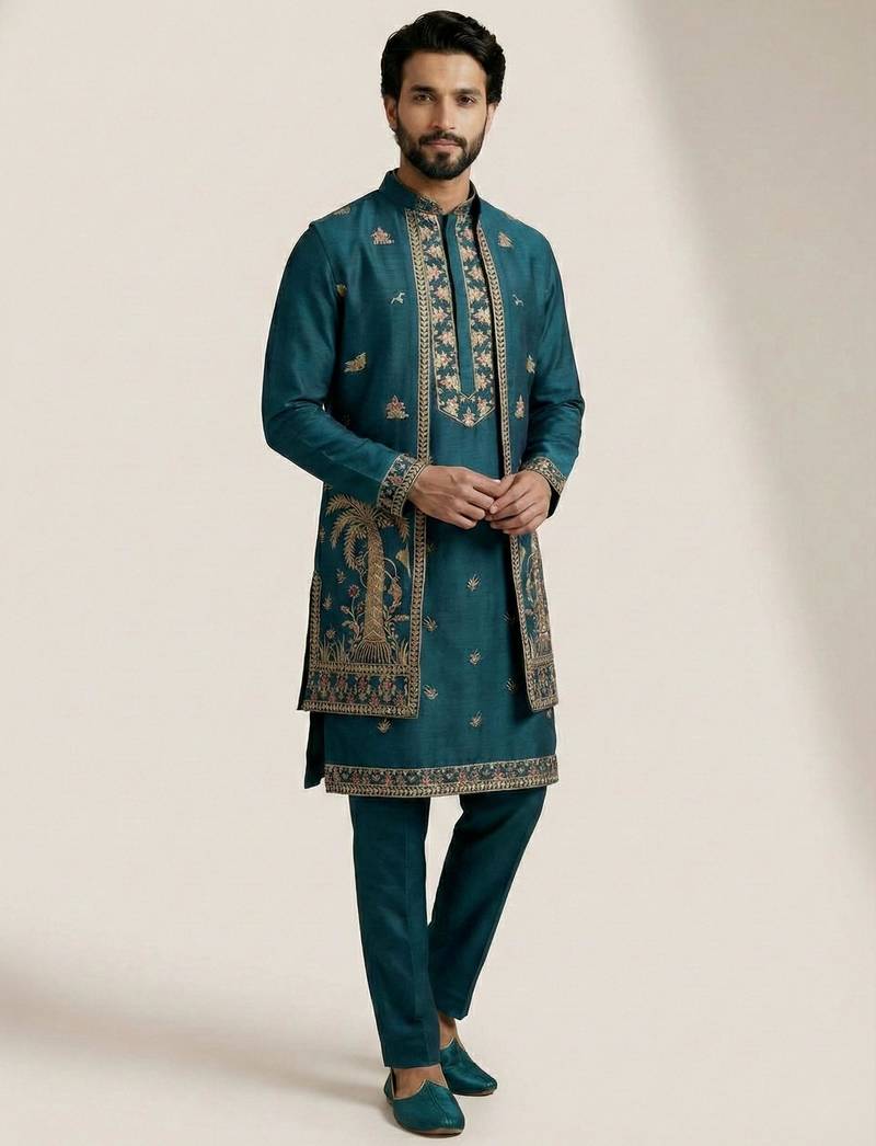 | Product Name | Teal Doniyar Shartin Men's Kurta Pyjama With Long Jacket | |