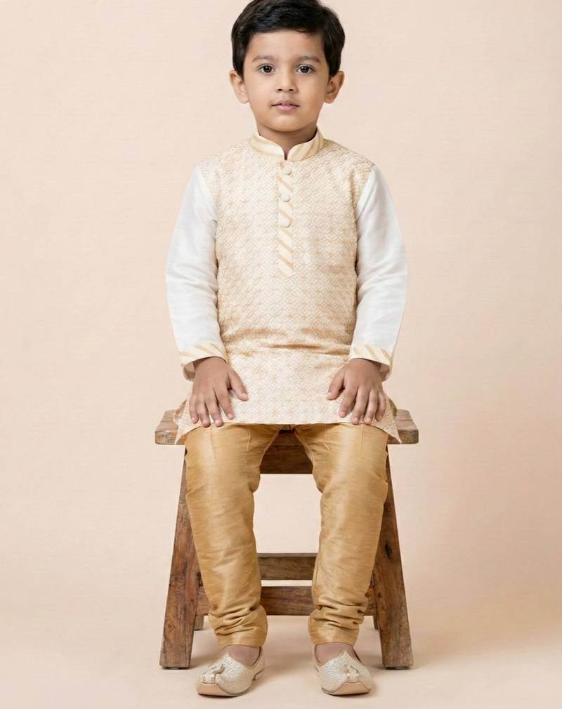 | Product Name | White Festive Wear Designer Banarasi Boys Kurta Pyjama | |