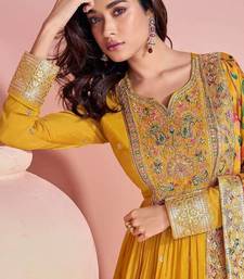 Yellow embroidered chinon free size anarkali suit semi stitched