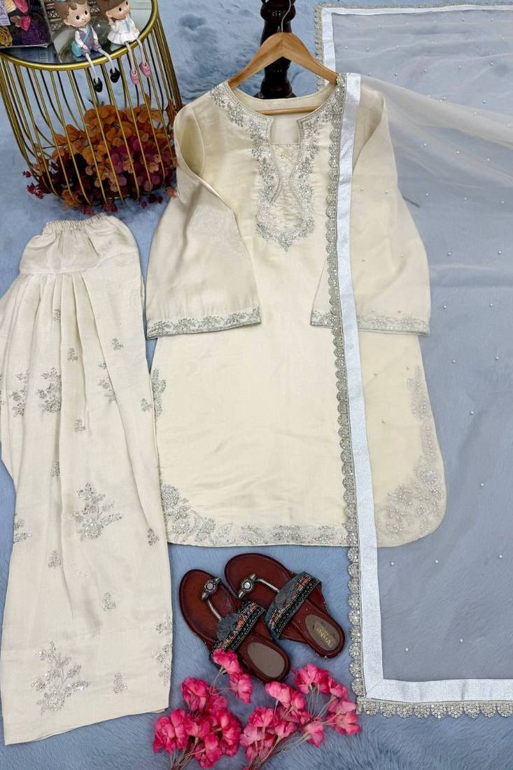 | Product Description | Stitched Roman Glass Silk Top (38") & Farshi Palazzo (41") With 3mm Sequence & Moti Work. Fancy Belly Sleeves. 2.2m Organza Dupatta With Cutwork Lace. Micro Cotton Inner. Sizes: M Xxl. Premium Designer Party Wear Look. |