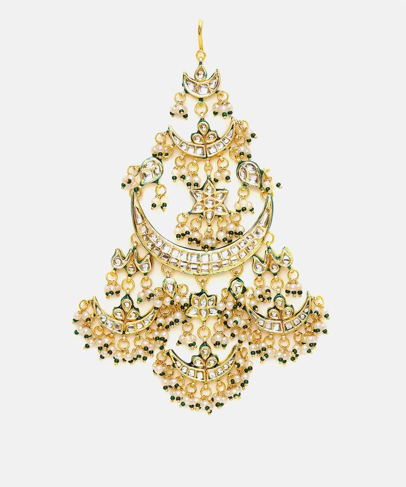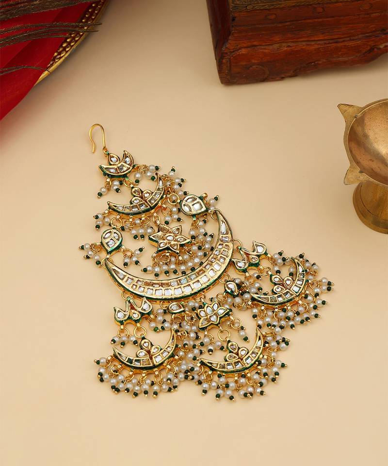| Product Description | This Gold Plated Kundan Passa Exudes Regal Charm With Its Elegant Crescent Silhouette And Intricate Detailing. Adorned With Classic Kundan Work And Delicate Green Bead Accents, It Adds A Festive, Traditional Touch. Perfect For Weddings, Celebrations, And Special Occasions, It Beautifully Complements Ethnic Ensembles With Timeless Sophistication.