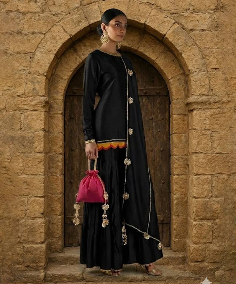 | • | Dupatta | : | Color- Black / Fabric- Silk Blend |