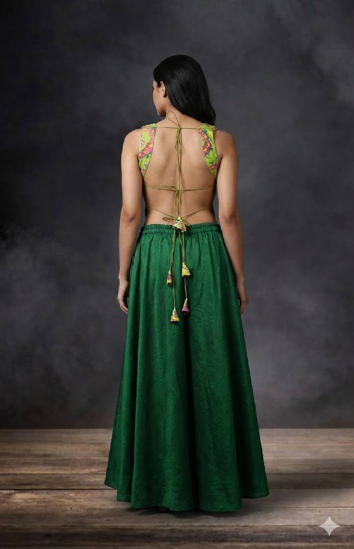 This Plus Size Ensemble Features A Vibrant Printed Sleeveless Blouse Paired With Rich Green Flared Pants For A Graceful, Flowy Silhouette. The Blouse Showcases A Colorful Print With A Stylish Back Tie Up Detail, Adding A Contemporary Touch, While The Elasticated Flared Pants Ensure Comfort And Movement.