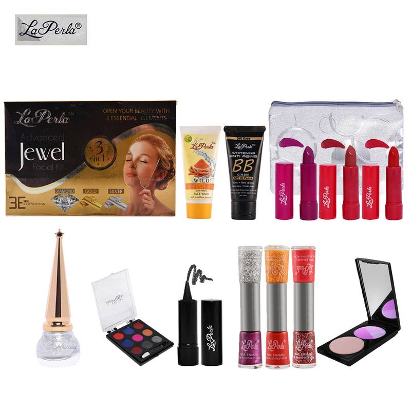 | Package Details | 1 Facial Kit 285 Gm /1 Bb Cream 60 Ml / 1 Eye Liner 5.5 Ml / 1 Kajal 3.5 Gm / 1 Eye Shadow 12 Gm / 1 Compact Powder 27 Gm / 1 Face Wash 60 Ml / Set Of 3 Lipstick / 1 Pouch / Set Of 3 Nail Paint | |