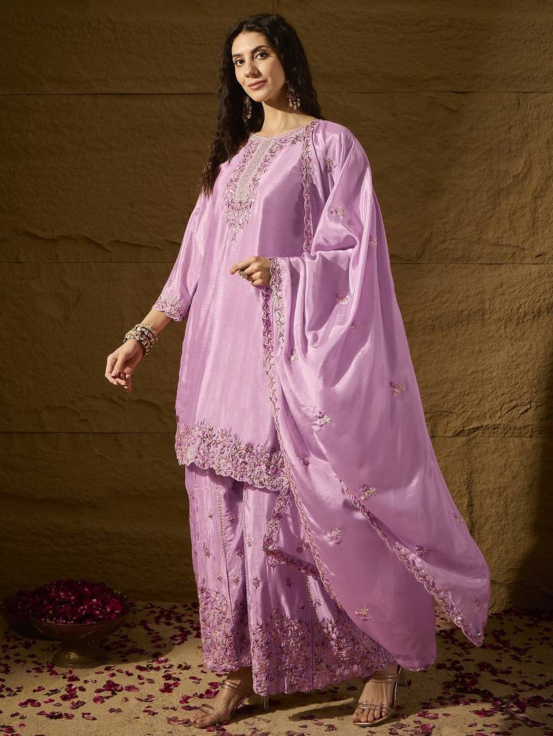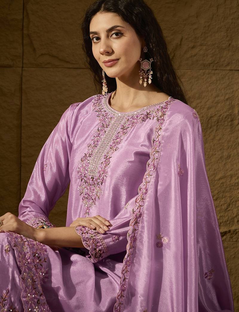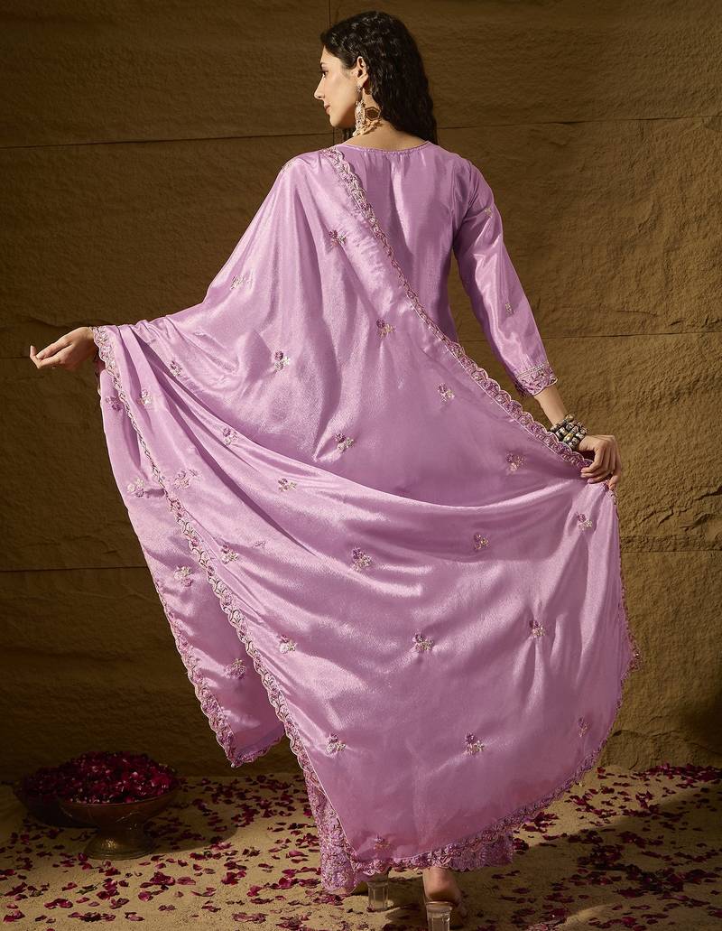 | Product Description | Radiate Softness In This Lavender Silk Salwar Kameez. This Set Features A Meticulously Embroidered Neckline And Hem, Paired With A Matching Dupatta That Drapes Beautifully. The Soothing Pastel Hue And Rich Fabric Make It An Ideal Choice For Festive Pujas And Elegant Family Gatherings. |